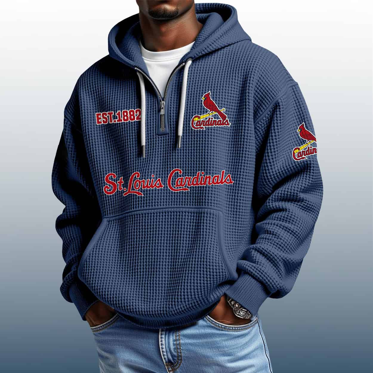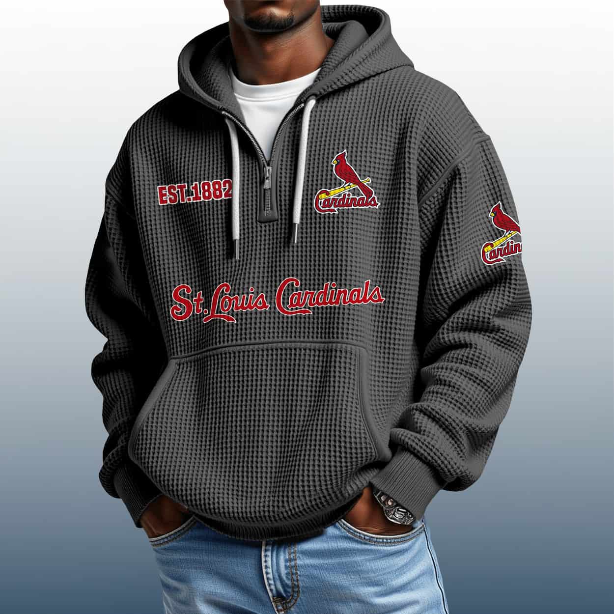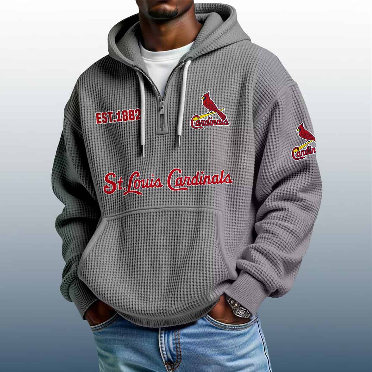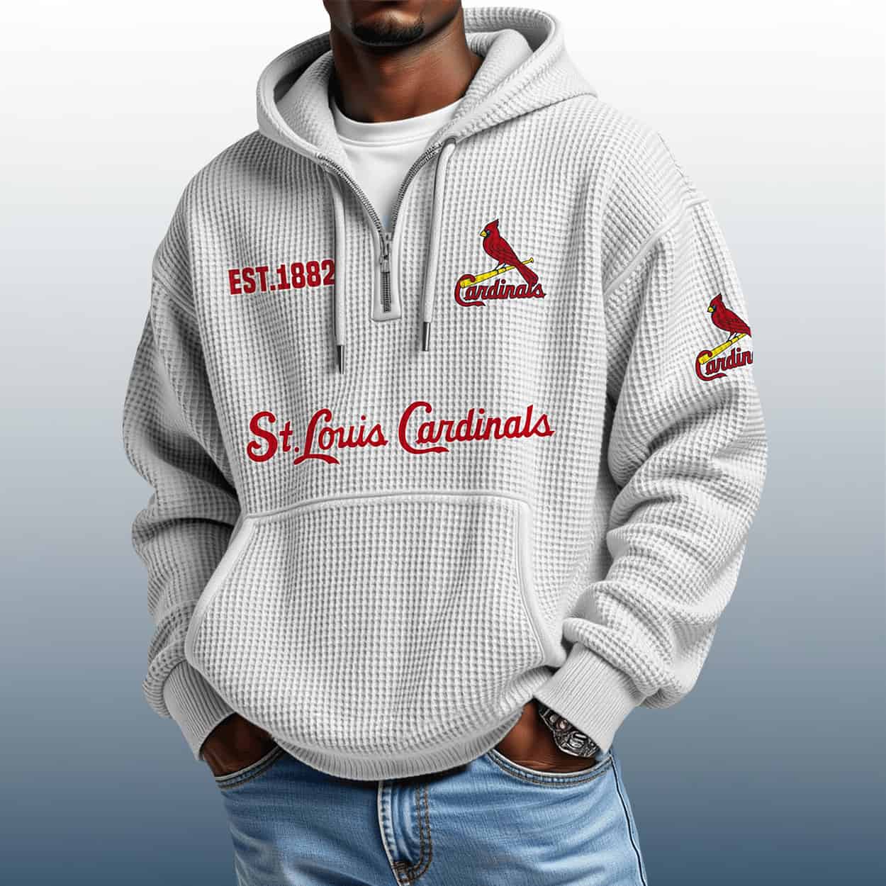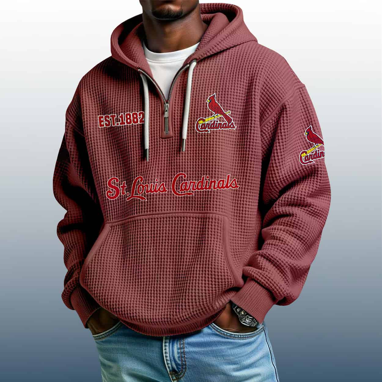 Celebrate over a century of Cardinals baseball with the St Cardinals Est 1882 Quarter Zip Waffle Hoodie—where timeless team pride meets bold fan fashion.