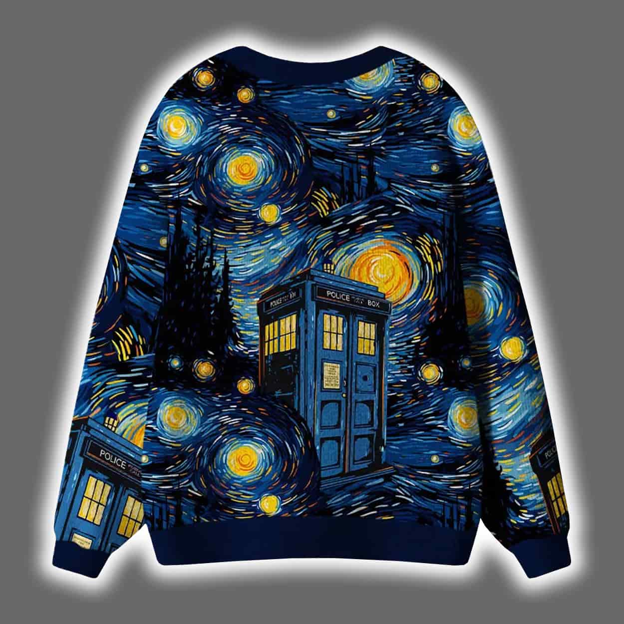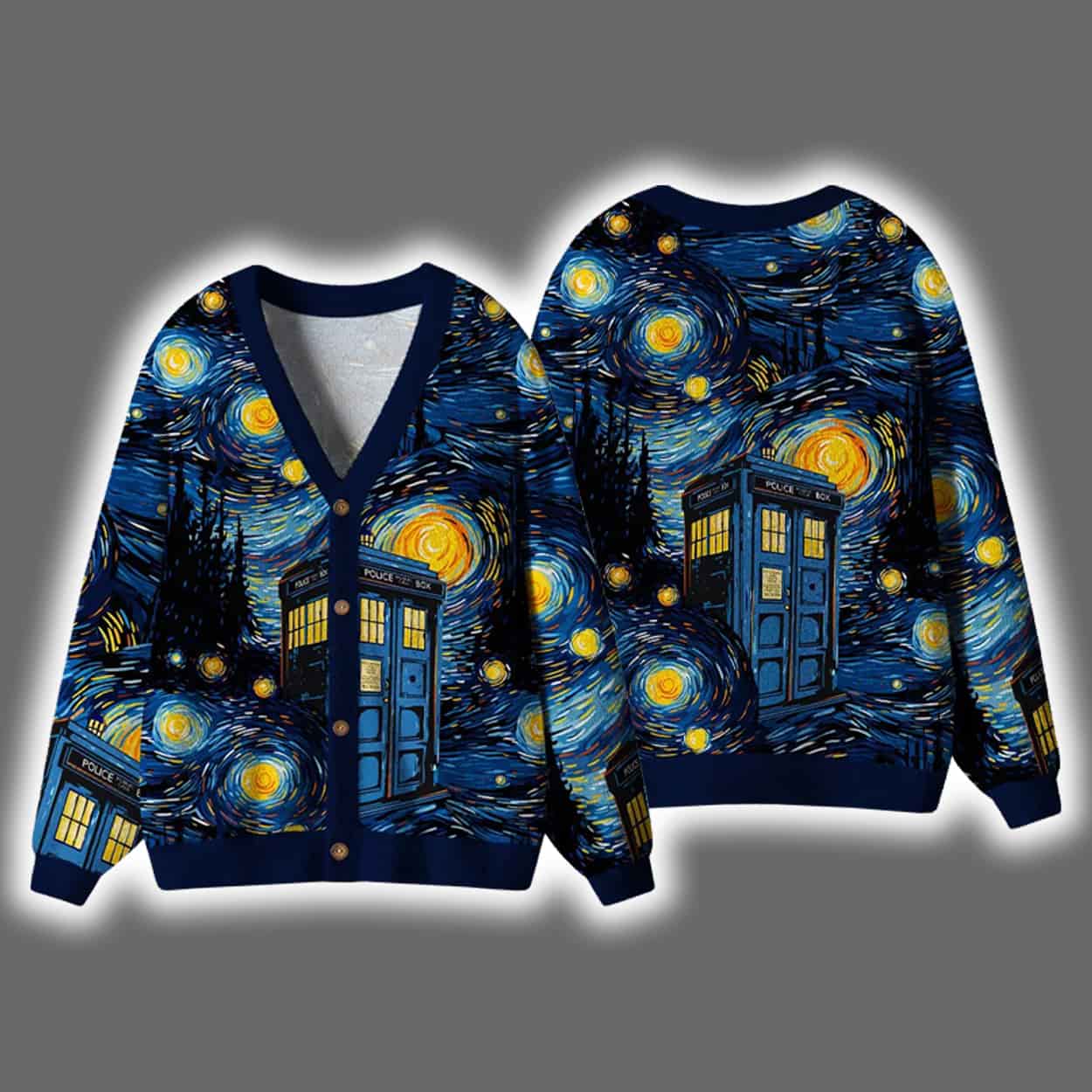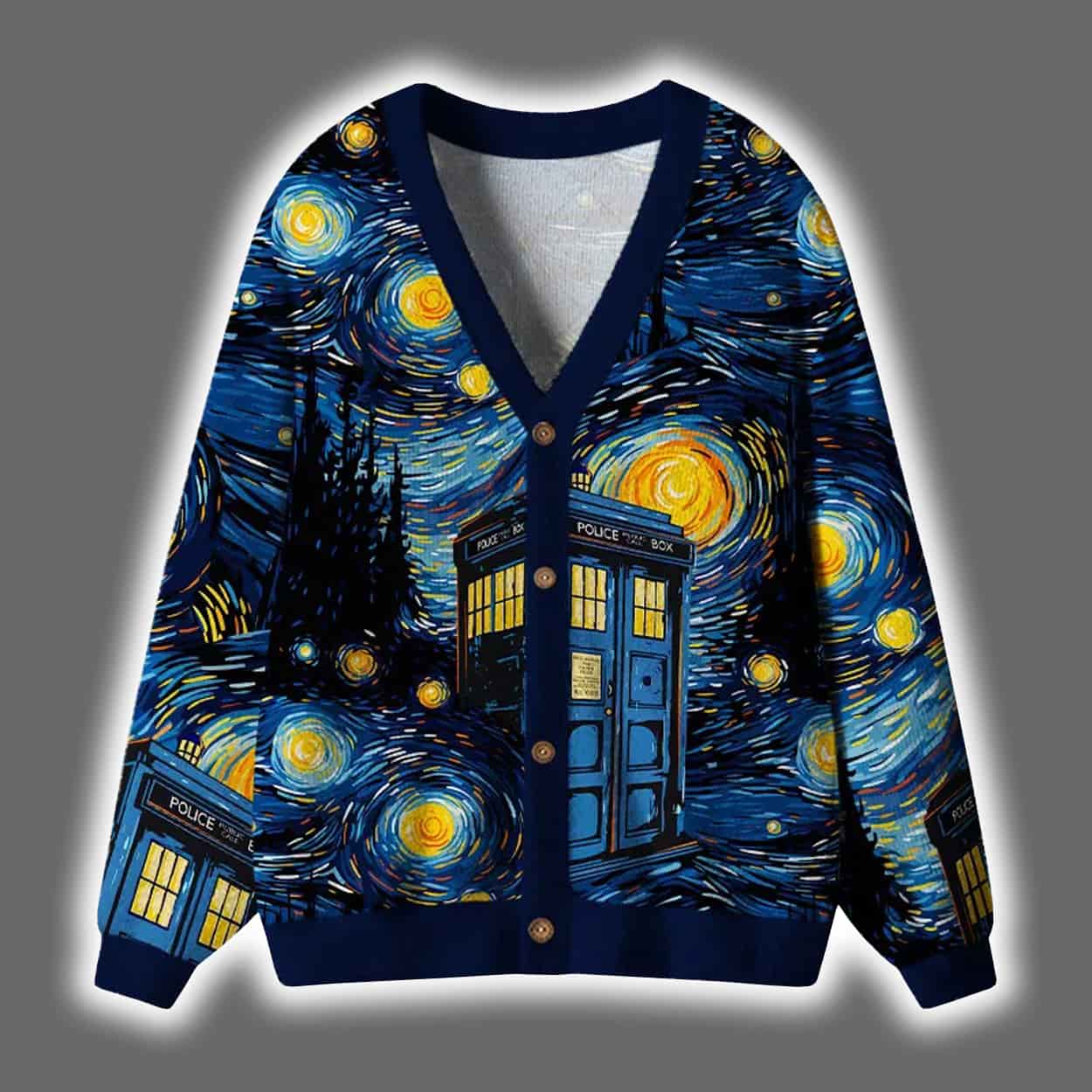 Make your festive wardrobe a masterpiece with this cardigan. This visually stunning piece features a swirling night sky inspired by Van Gogh’s iconic painting, rendered in vibrant blues and yellows. Nestled within the cosmic chaos is a familiar blue police box—the legendary time-traveling phone booth—adding a pop culture twist to the classic art. The design wraps around both front and back, creating a seamless celestial canvas that’s as mesmerizing as it is merry.