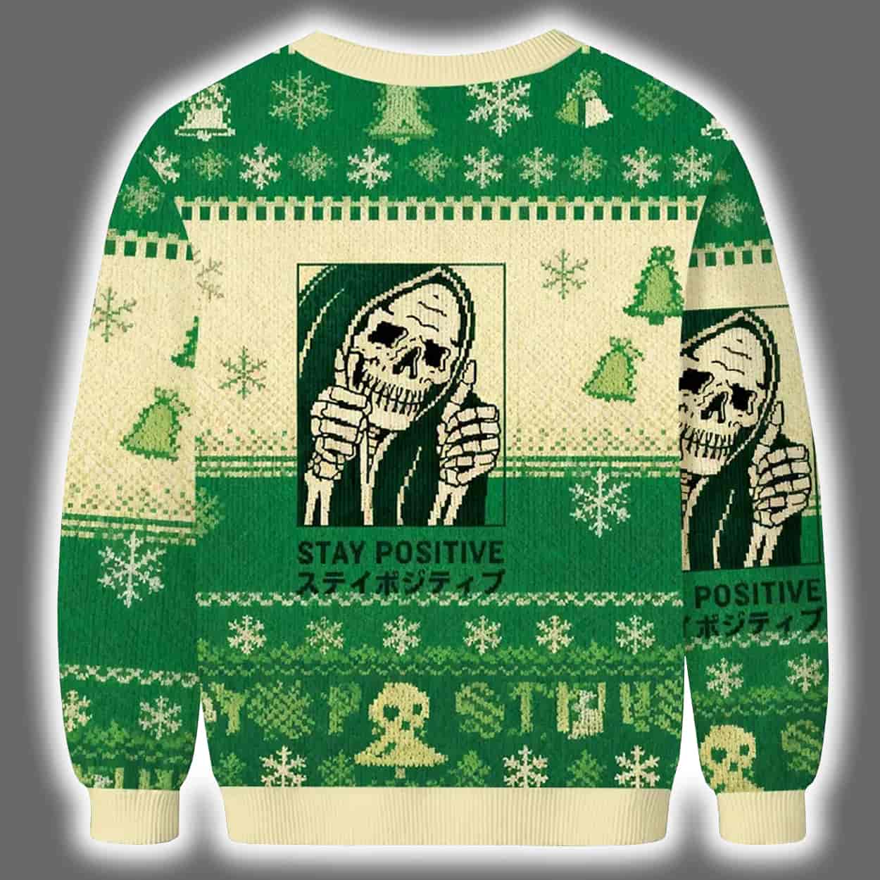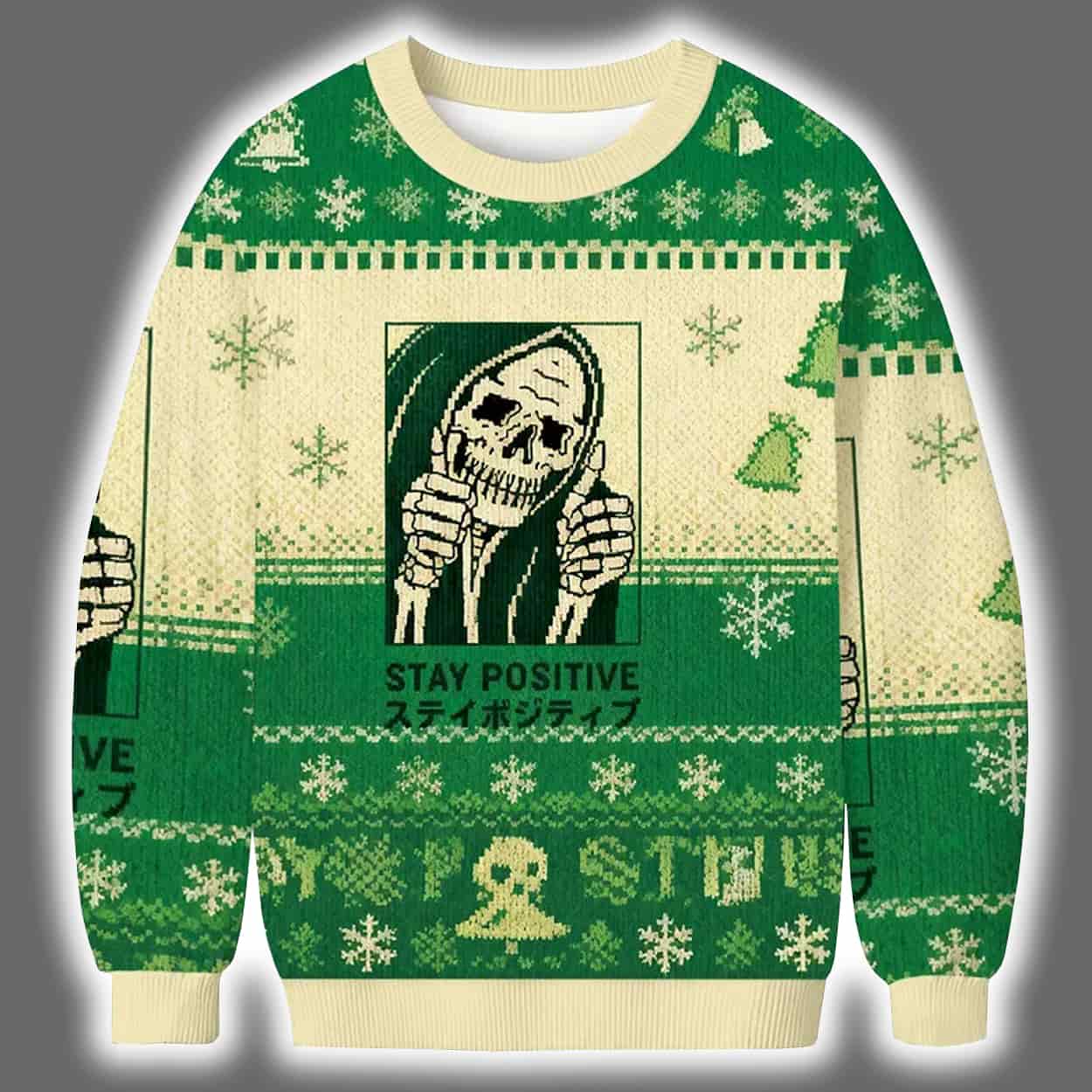 Ready to make merry with a twist of macabre? Slip into the Stay Positive Skeleton Ugly Christmas Sweater and let your wardrobe reflect your wonderfully warped sense of humor. Because nothing says “holiday cheer” like a reaper with a message.