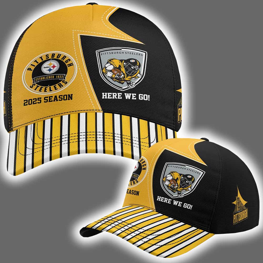 Step into the 2025 season with a cap that’s as bold as your loyalty. The Steelers 2025 Season Cap is a visual powerhouse, decked out in classic black and yellow with a striking vertical stripe pattern that runs across the front panel and brim. Dominating the front are two standout logos: the Steelers emblem and a fierce shield design featuring a tiger and football motif—because this season, it’s all about grit and growl. Just below, the phrases “2025 SEASON” and “HERE WE GO!” rally fans with unmistakable energy. On the side, a star-studded logo and the word “Steelers” add an extra punch of pride.