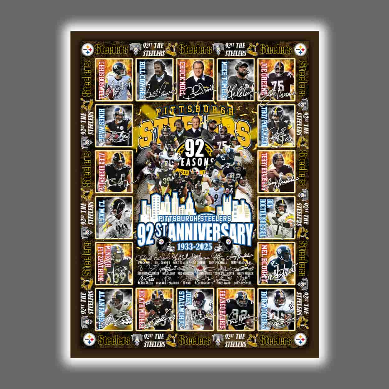 Honor the black and gold with this blanket—a vibrant tribute to one of football’s most storied franchises. The design bursts with energy, showcasing legendary Steelers players in action, each framed with their name and jersey number. At the center, bold text reads “Steelers 92nd Season” and “92nd Anniversary 1933–2025,” surrounded by team colors, football motifs, and the unmistakable Steelers logo. Whether draped over your couch or worn proudly at a tailgate, this blanket turns any space into a shrine of Steelers pride.