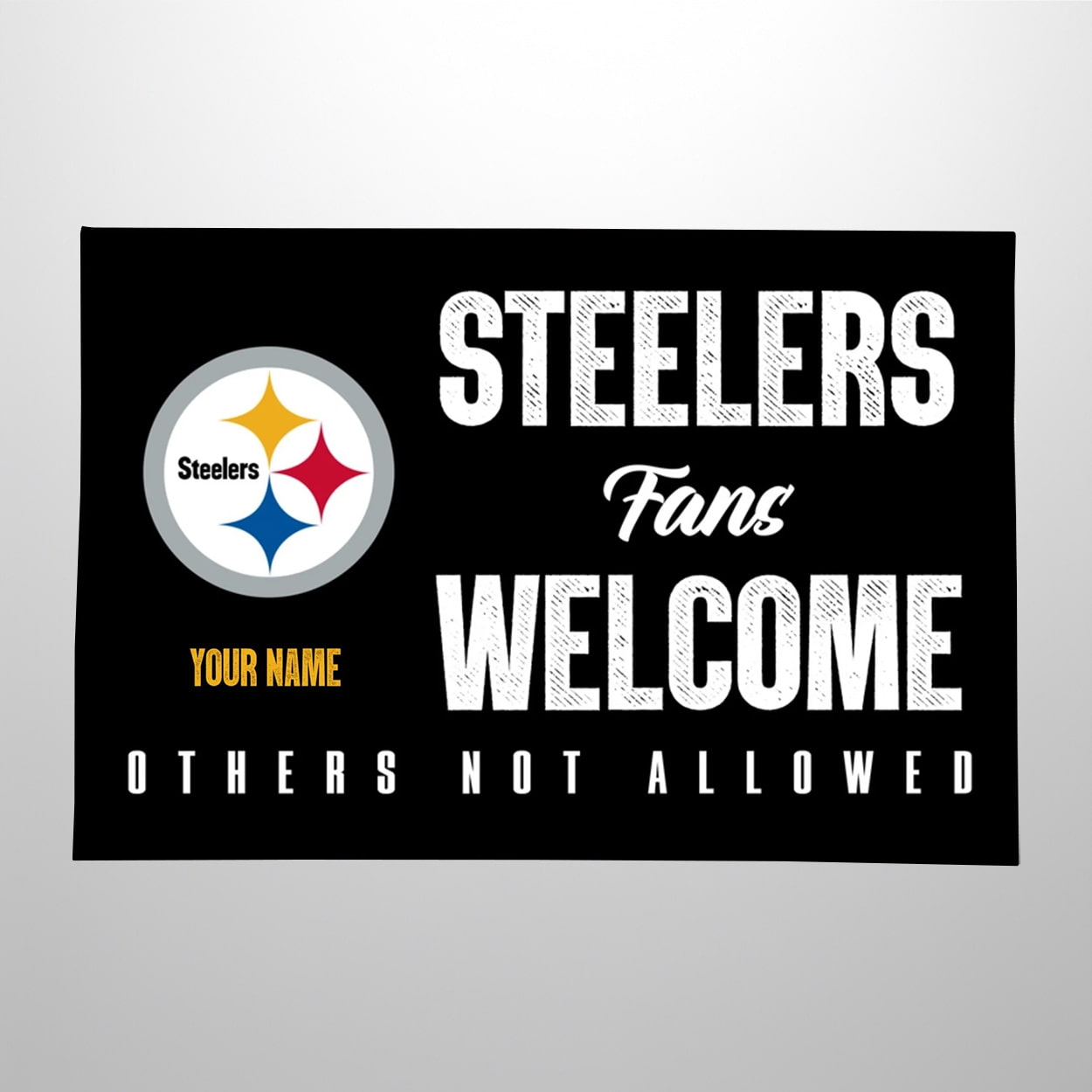 Make your entrance unforgettable with this doormat that’s as bold as your team spirit. Set against a sleek black backdrop, the iconic Steelers logo shines on the left, flanked by a cheeky message in bold white and yellow: “STEELERS Fans WELCOME – YOUR NAME – OTHERS NOT ALLOWED.” The customizable name section lets you stamp your turf with pride, turning any doorway into a fan zone. Whether it’s your home, man cave, or tailgate setup, this mat sends a clear message—Steelers fans belong, everyone else can keep walking.
