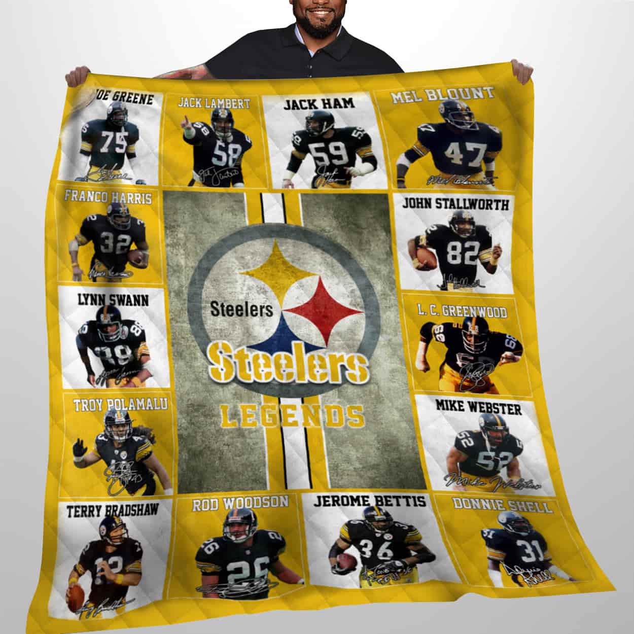 Celebrate the golden legacy of Pittsburgh football with this blanket—a visual touchdown of history and pride. The centerpiece features the iconic Steelers logo with the word “LEGENDS” boldly beneath it, surrounded by a lineup of football royalty. From Joe Greene (#75) to Hines Ward (#86), each player is captured in uniform with their name and jersey number, framed like portraits in a hall of fame. The vibrant yellow border adds a pop of team spirit, while the layout reads like a playbook of greatness.