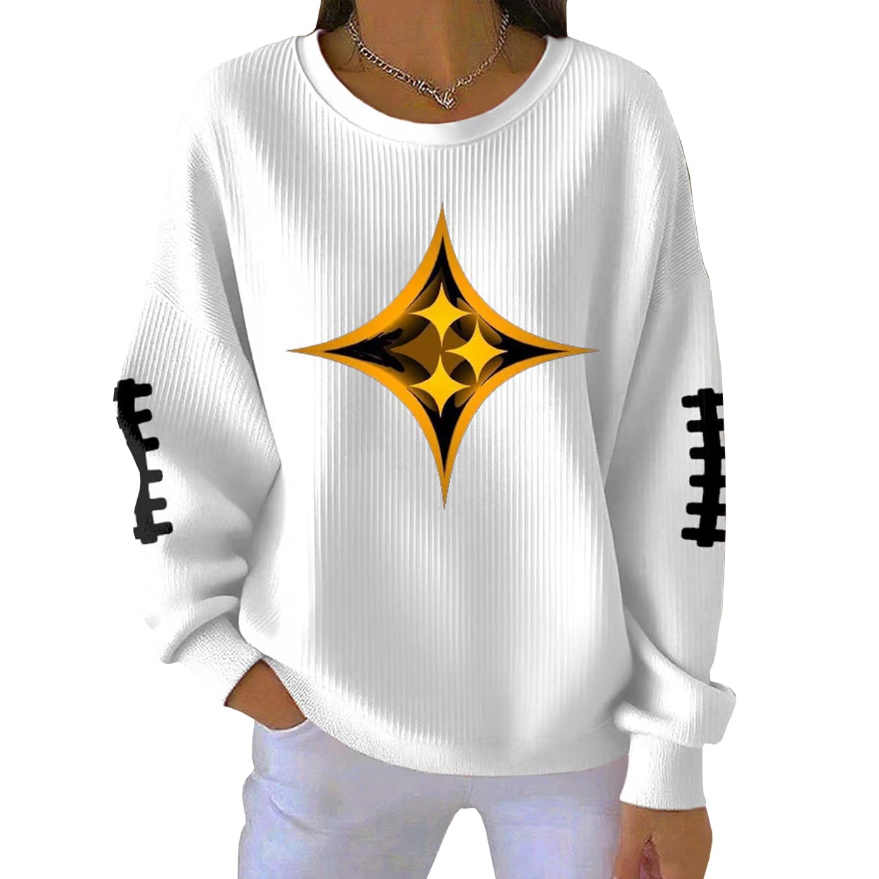 Crafted in crisp white ribbed fabric, this sweatshirt features a bold, symmetrical emblem at the chest: a four-pointed star-like design in metallic gold and black, radiating industrial elegance and Pittsburgh pride. The sleeves are accented with black stitch-like graphics, evoking the toughness of steel beams or the laces of a football spiraling toward justice. It’s not just stylish—it’s symbolic.