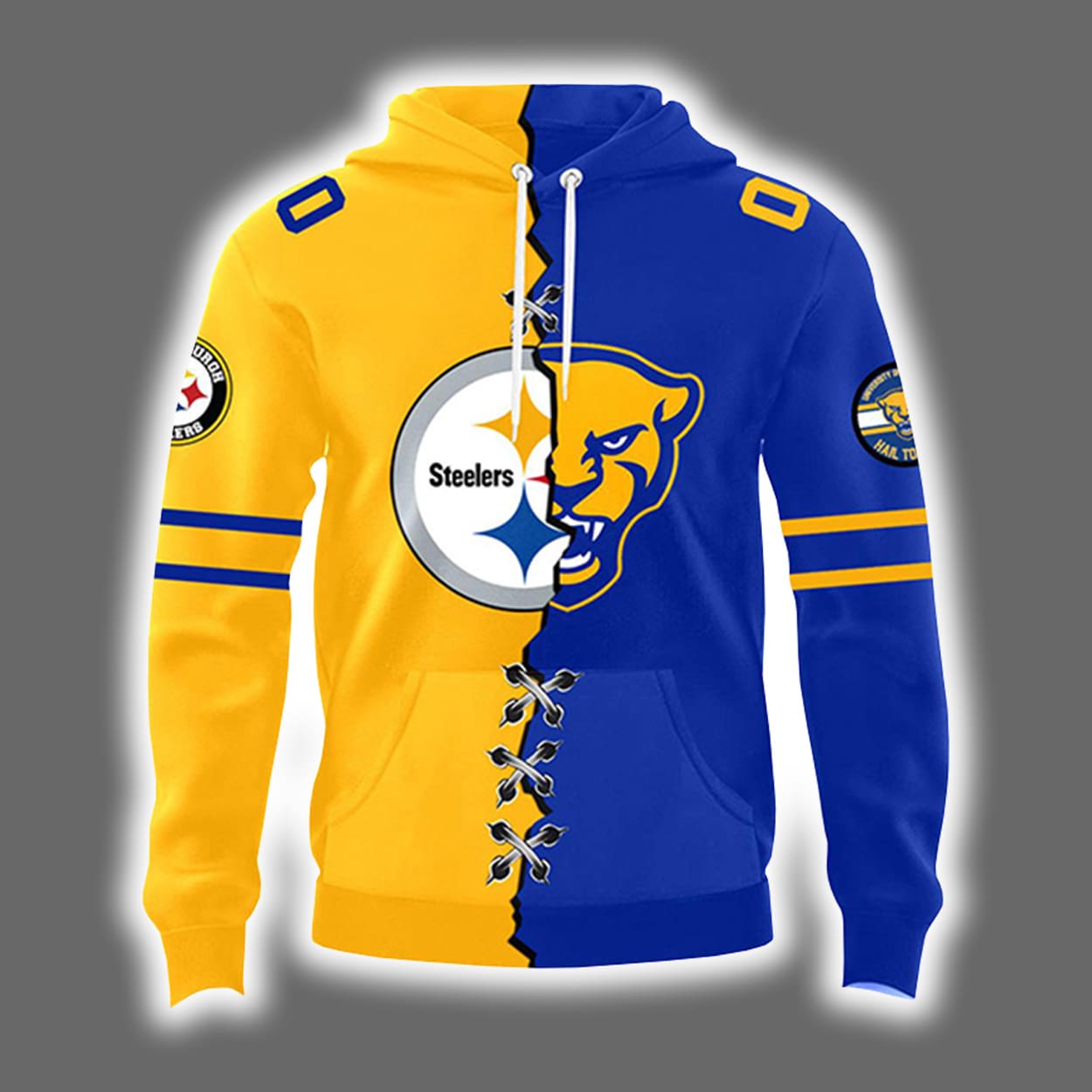 This hoodie is a touchdown for fans who live and breathe football history. The left side reps the Steelers in classic black and gold, while the right side showcases the Panthers in bold blue and yellow. Front and center, the team logos stand proud, flanked by sporty sleeve stripes and a lace-up detail that adds a vintage twist. On the back, two illustrated players—wearing jerseys #13 and #12—channel the spirit of Marino and Bradshaw. Above them, your name takes the spotlight, making this hoodie uniquely yours. A signature from artist Joe Maguire adds an extra layer of authenticity.