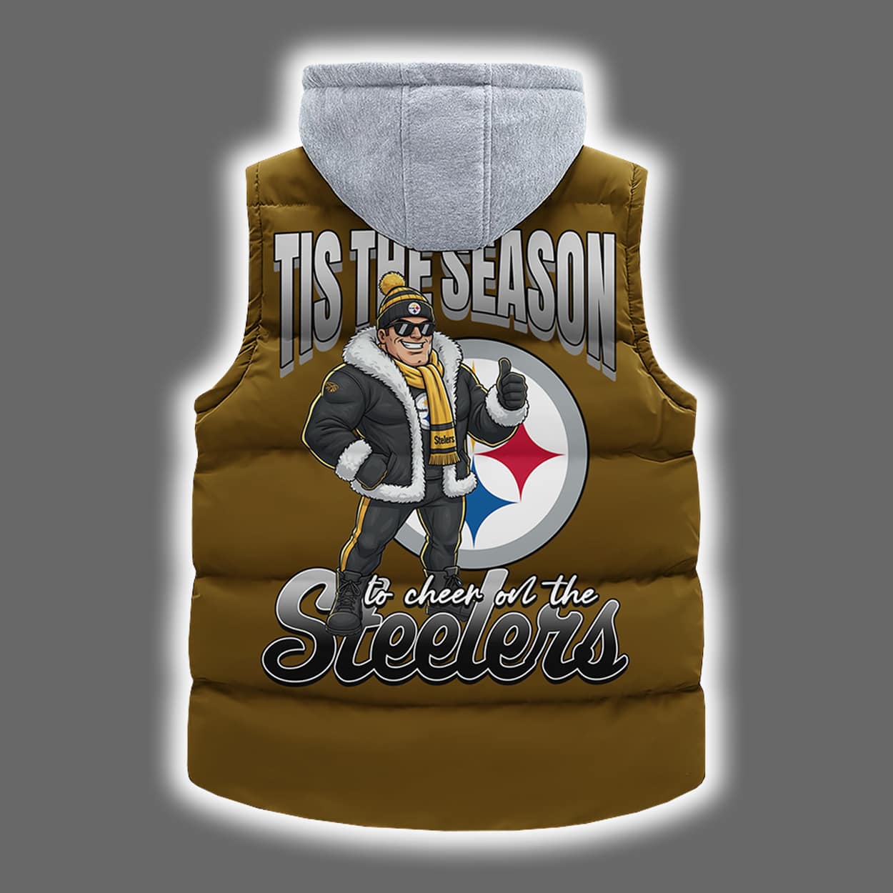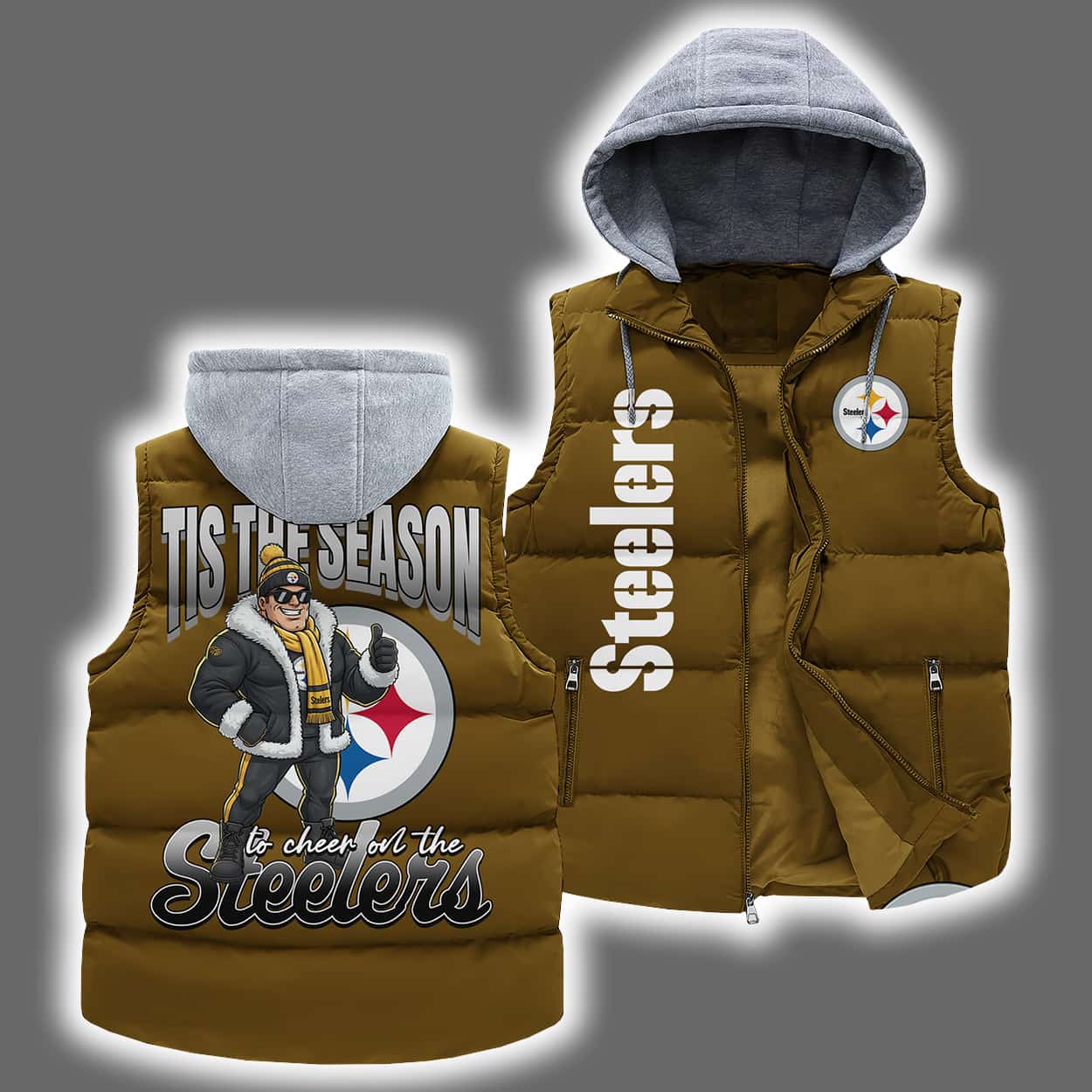 This hooded vest is a winter-ready tribute to Steelers football, designed to keep you cozy while turning heads. The front features the Steelers logo on the upper left chest and the word “Steelers” running vertically down the left side—clean, bold, and unmistakably loyal. But the real magic is on the back: a festive illustration of a fan decked out in Steelers-themed winter gear standing proudly beside the team logo. Above the scene, “TIS THE SEASON” sets the holiday vibe, while below, the phrase “to cheer for the Steelers” wraps it all up like a perfectly placed bow.