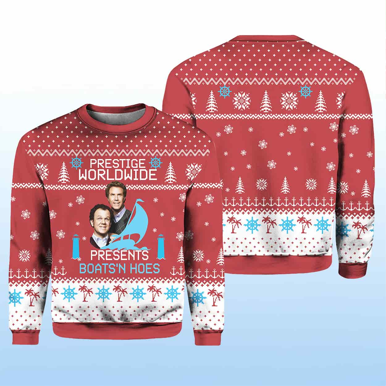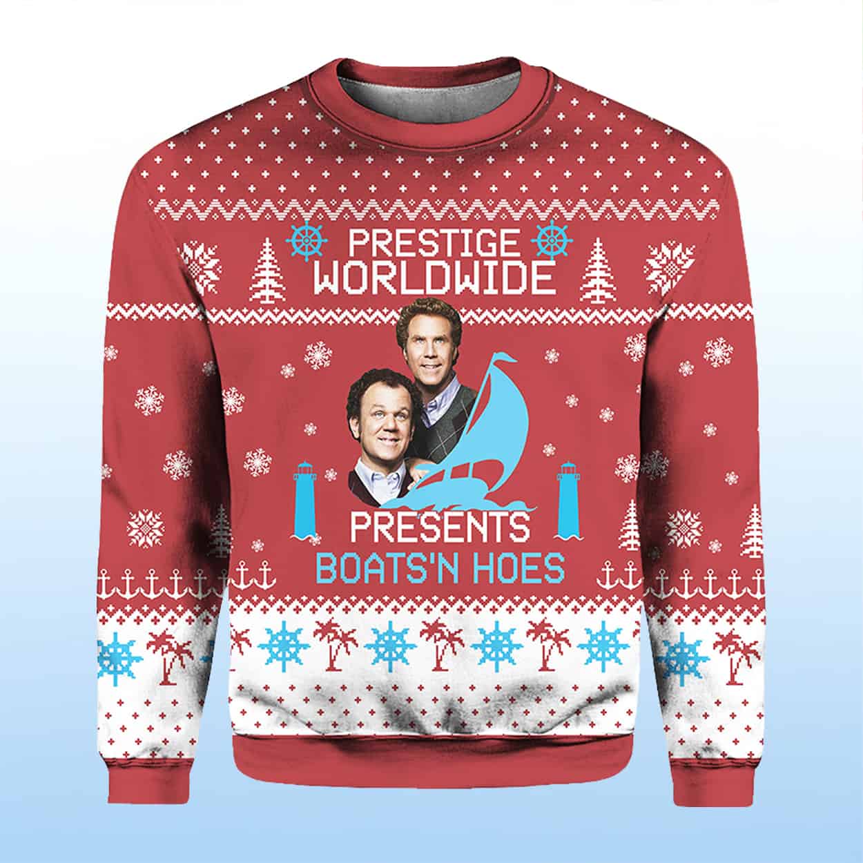 Make waves this holiday season with the Step Brothers Prestige Worldwide Presents Boats ‘N Hoes Ugly Christmas Sweater—a hilarious nod to Prestige Worldwide and festive absurdity.