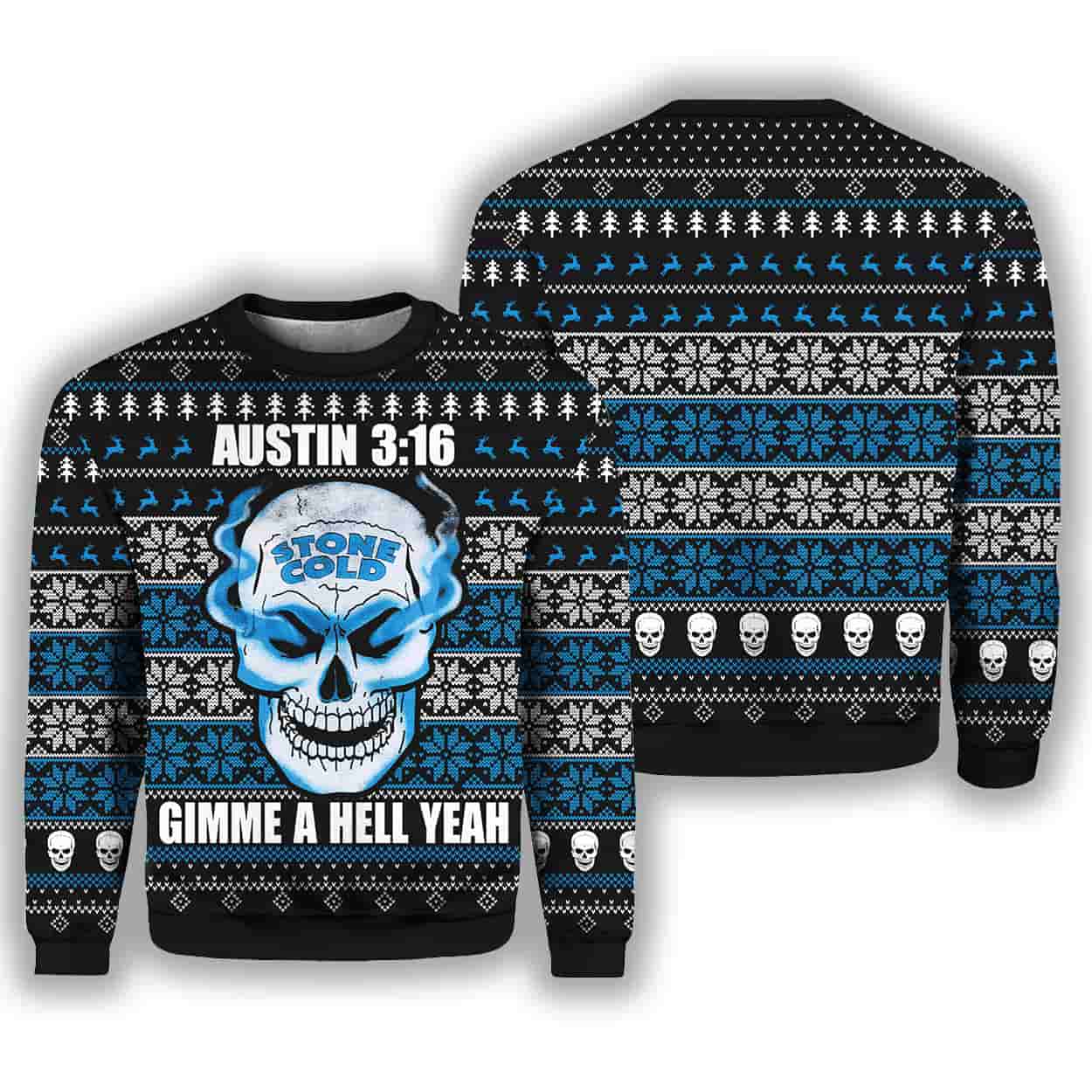 Step aside, Santa—Stone Cold Steve Austin is crashing the holiday party. This sweater is a tribute to the Texas Rattlesnake himself, blending festive charm with unapologetic attitude. The front showcases a fierce blue skull with smoke billowing from its eyes, stamped with “STONE COLD” across the forehead. Above it, the legendary “AUSTIN 3:16” reminds everyone of the moment wrestling history was made, while the bottom dares you to shout “GIMME A HELL YEAH!” loud and proud.