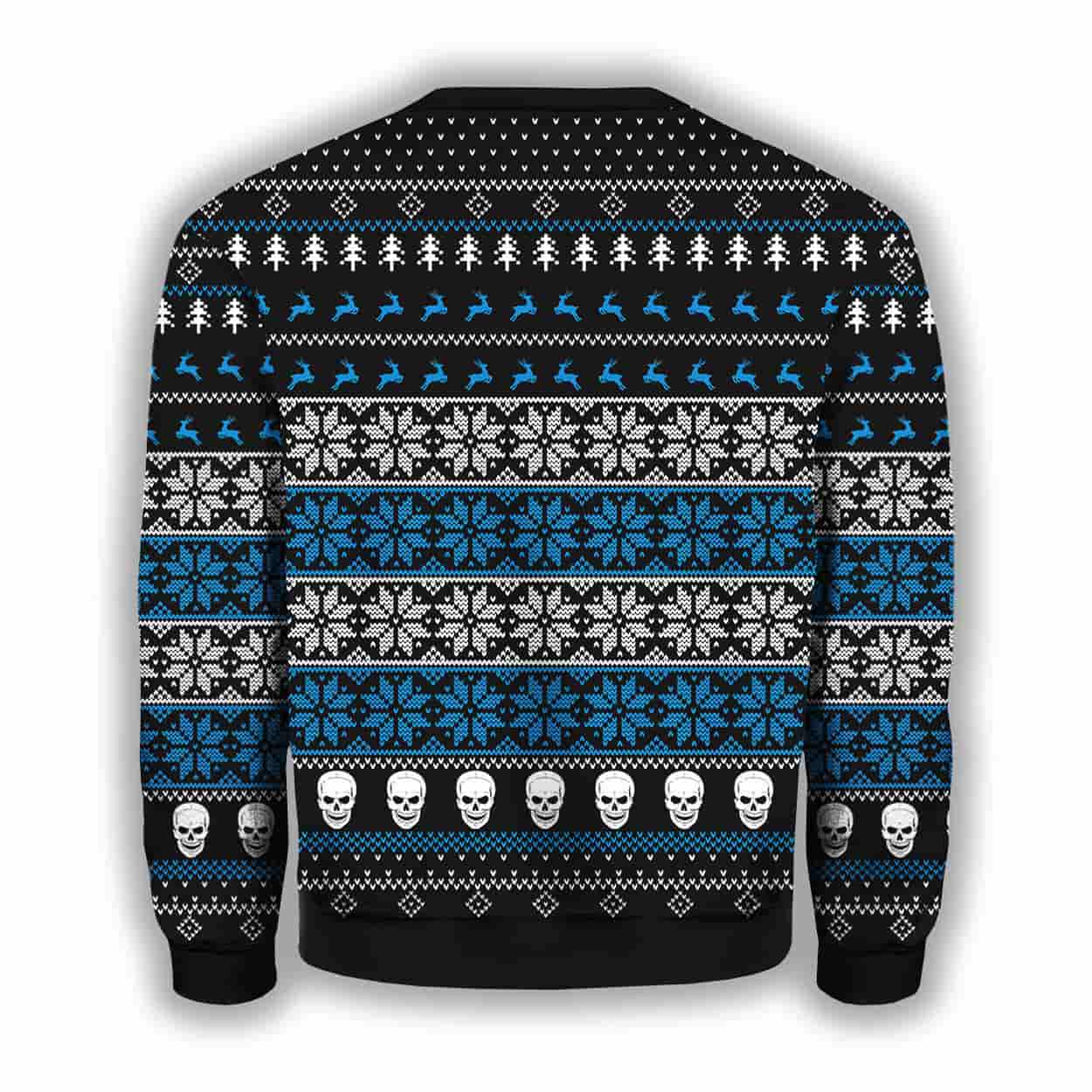 This isn’t just a sweater—it’s a statement. Inspired by one of the most iconic figures in wrestling, the design fuses holiday motifs with rebellious energy. The back features rows of snowflakes, reindeer, and skulls in a wintry palette of black, blue, white, and gray. It’s festive, it’s fierce, and it’s perfect for fans who like their Christmas with a side of chaos.