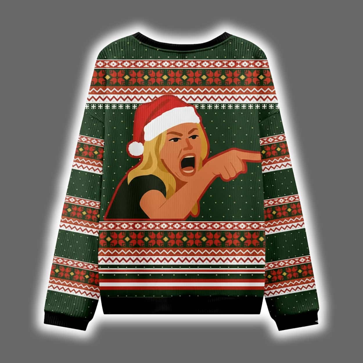 Turn heads and spark laughter with this sweater—a bold blend of festive charm and meme-worthy humor. Front and center is a cartoon woman in a Santa hat, pointing and yelling with theatrical flair. Beneath her, the phrase “STOP EATING THE TINSEL” is printed in bold white letters, capturing the chaos and comedy of holiday gatherings. The sweater’s background is a vibrant mix of red, green, white, and black, decorated with snowflakes and geometric shapes that wrap around the sleeves and continue on the back, minus the illustration and text.