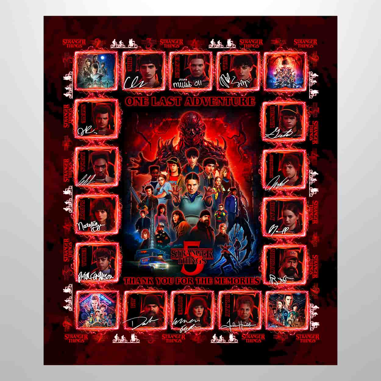Wrap yourself in the thrilling legacy of Hawkins with this blanket. This striking design features a central collage of the beloved cast, surrounded by individual character portraits complete with their signatures—like a yearbook from the Upside Down. The intense red and black backdrop sets the mood for one final showdown, while the bold “ONE LAST ADVENTURE” at the top and heartfelt “THANK YOU FOR THE MEMORIES” at the bottom make this blanket more than cozy—it’s cinematic.
