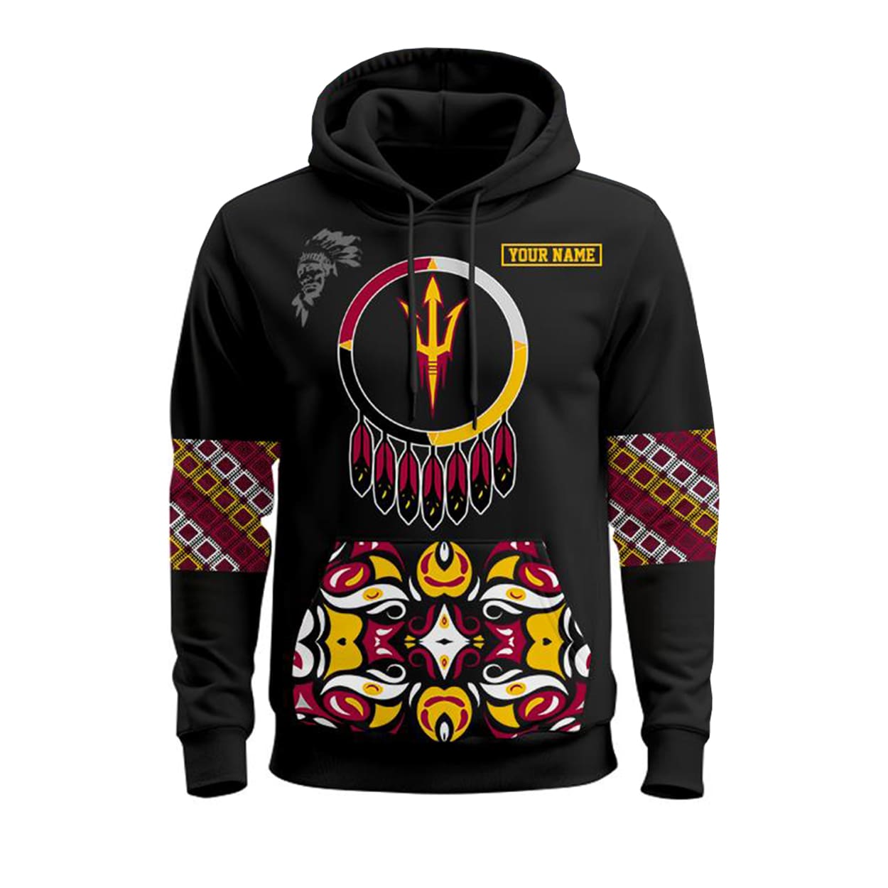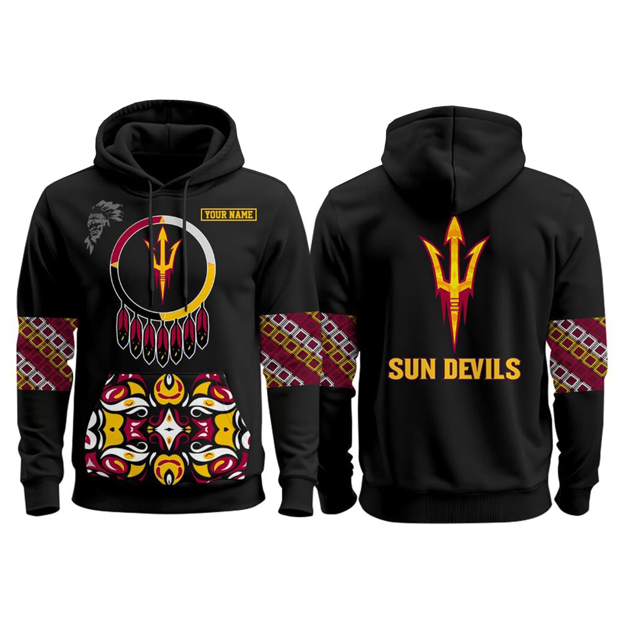 This hoodie is more than just a layer—it’s a statement. The front features a mesmerizing circular design that evokes a dreamcatcher, centered around a powerful trident symbol. Beneath it, symmetrical tribal patterns in red, yellow, white, and black add depth and movement. Flip it around and the back commands attention with a bold trident above the words “SUN DEVILS” in blazing yellow. Both sleeves continue the patterned strip, tying the whole look together with cultural flair.