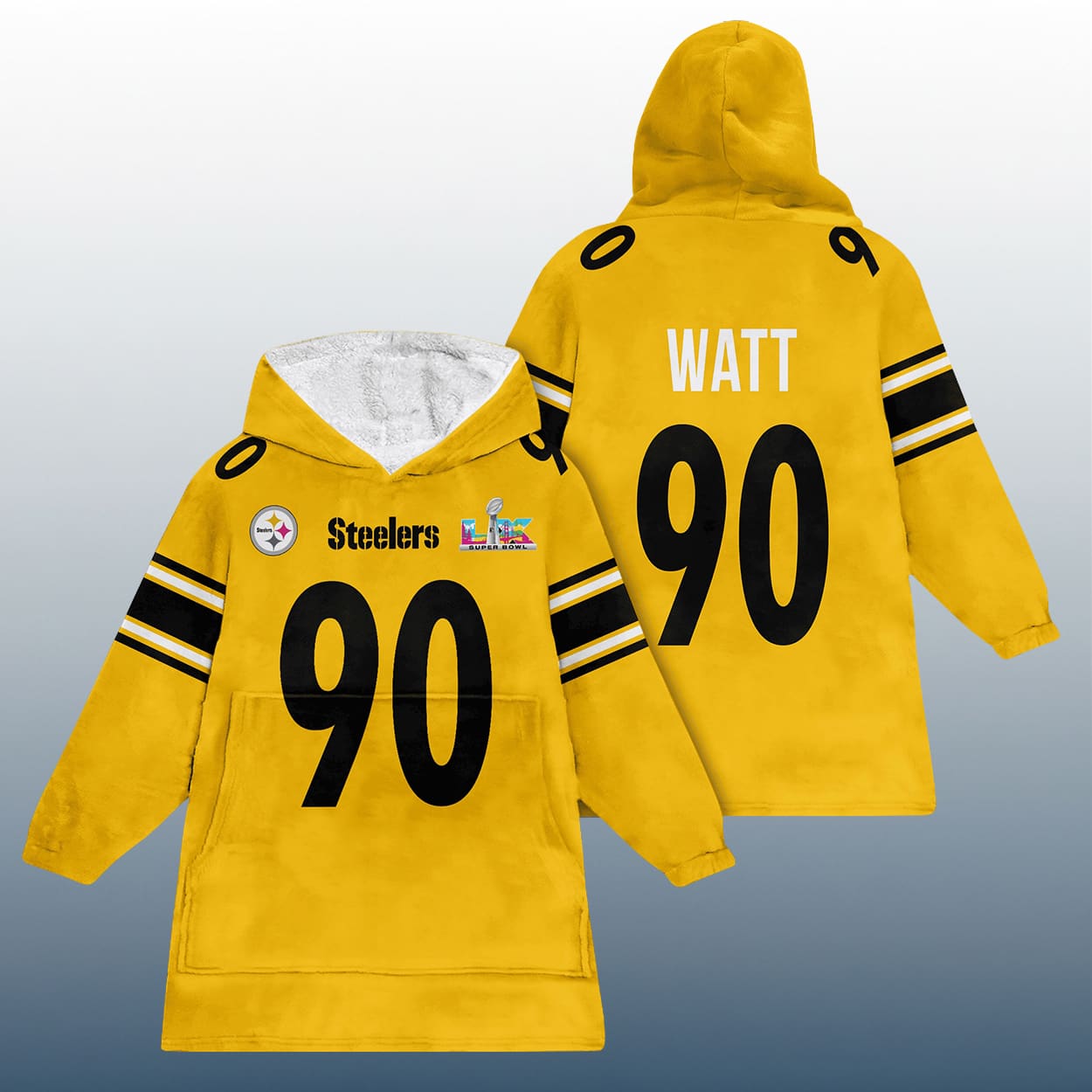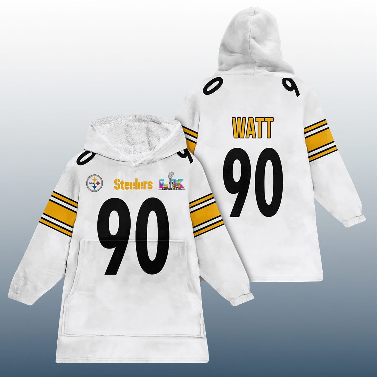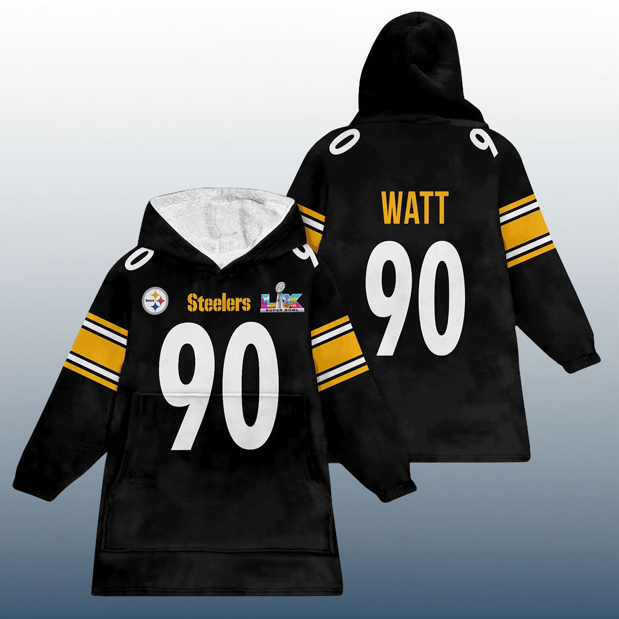 Unleash your inner linebacker with the T.J.W 90 Pittsburgh Football SB LX Unisex Blanket Hoodie—a bold, oversized tribute to Steelers star T.J. Watt and SB swagger.