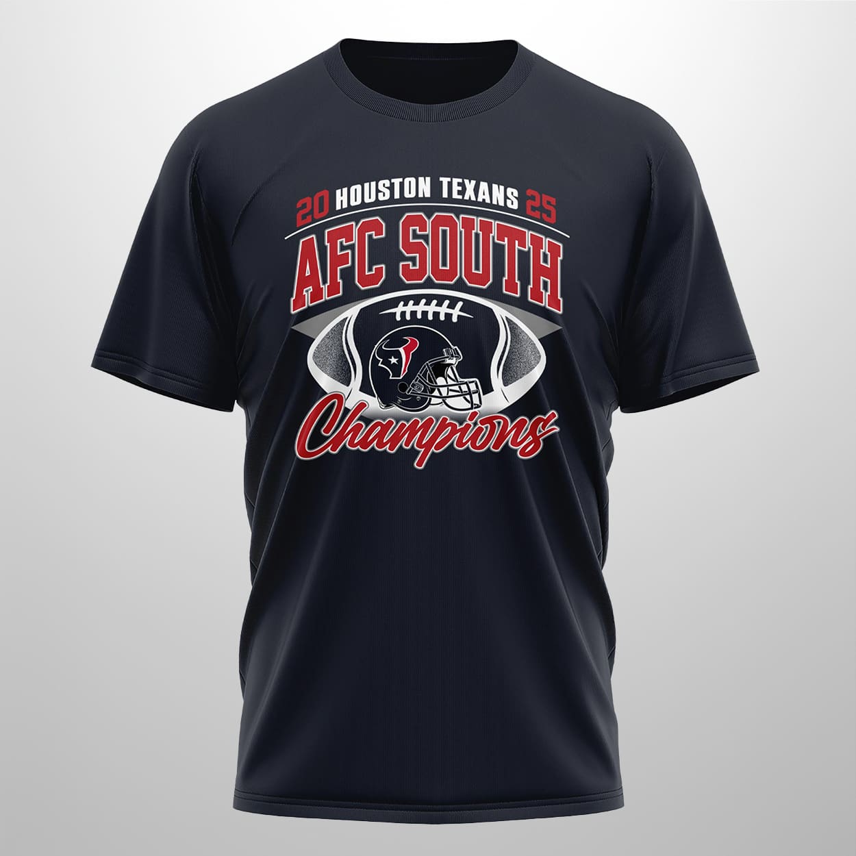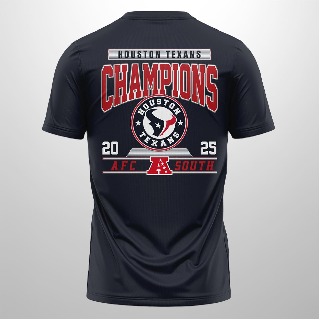 Step into the winner’s circle with the ultimate fan tribute. The front proudly showcases “TEXANS,” “AFC SOUTH,” and “Champions” in bold, triumphant lettering, wrapped around a dynamic football graphic featuring the unmistakable Texans logo. Flip it over and the celebration continues: “CHAMPIONS,” “2025,” and “AFC SOUTH” blaze across the back, anchored by a circular emblem with the Texans logo and a bold red “A” that screams AFC pride. This shirt isn’t just apparel—it’s a wearable trophy.
