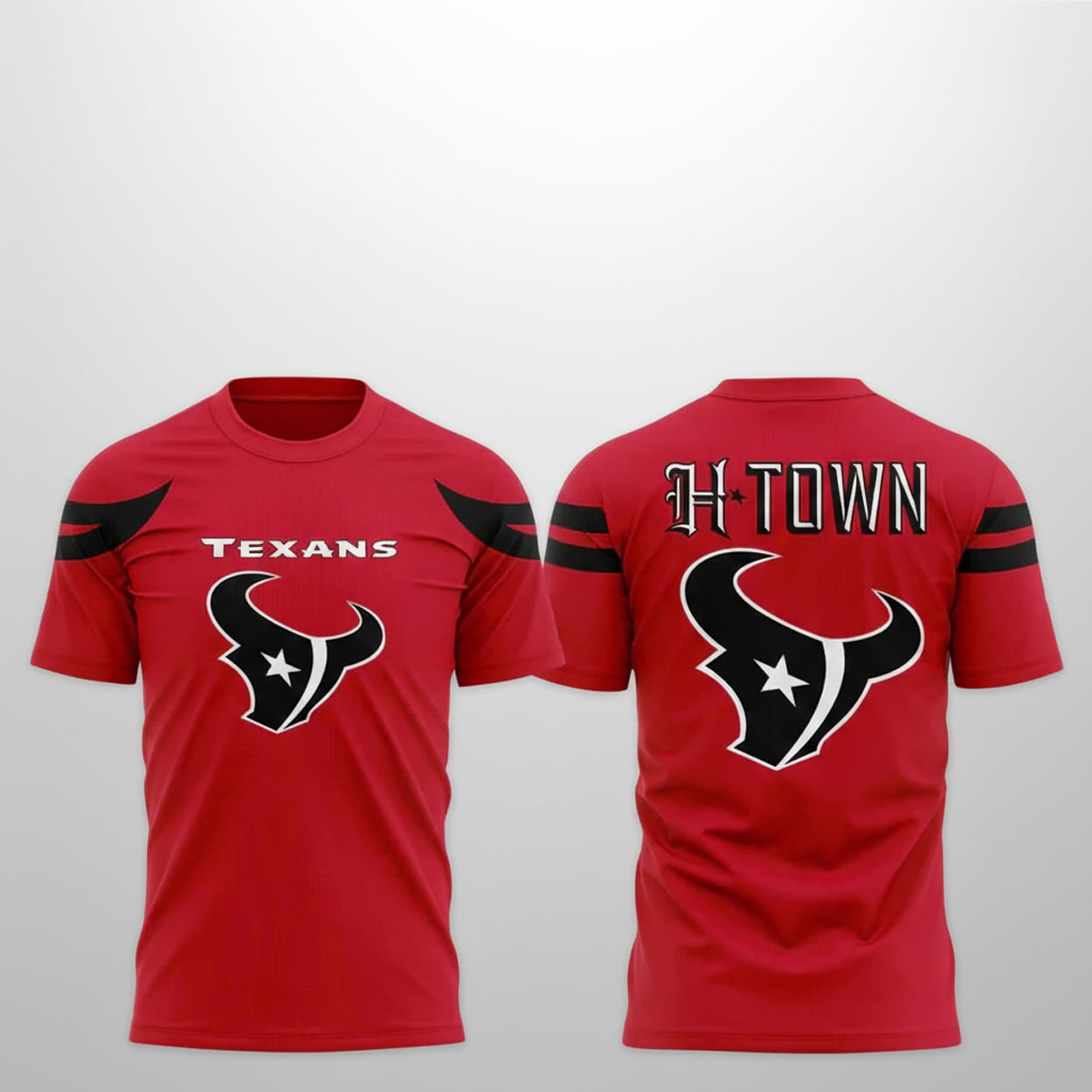 Get ready to turn heads and rally the herd with this shirt. This shirt is a visual touchdown, featuring bold black sleeve stripes and a front chest shout-out to “TEXANS” in crisp white. Anchoring the look is a powerful bull’s head logo—black, sharp, and centered with a white star that screams Texas pride. Flip it around and you’ll find “H-TOWN” blazing across the upper back, backed by the same fierce bull emblem. It’s not just a shirt—it’s a declaration.