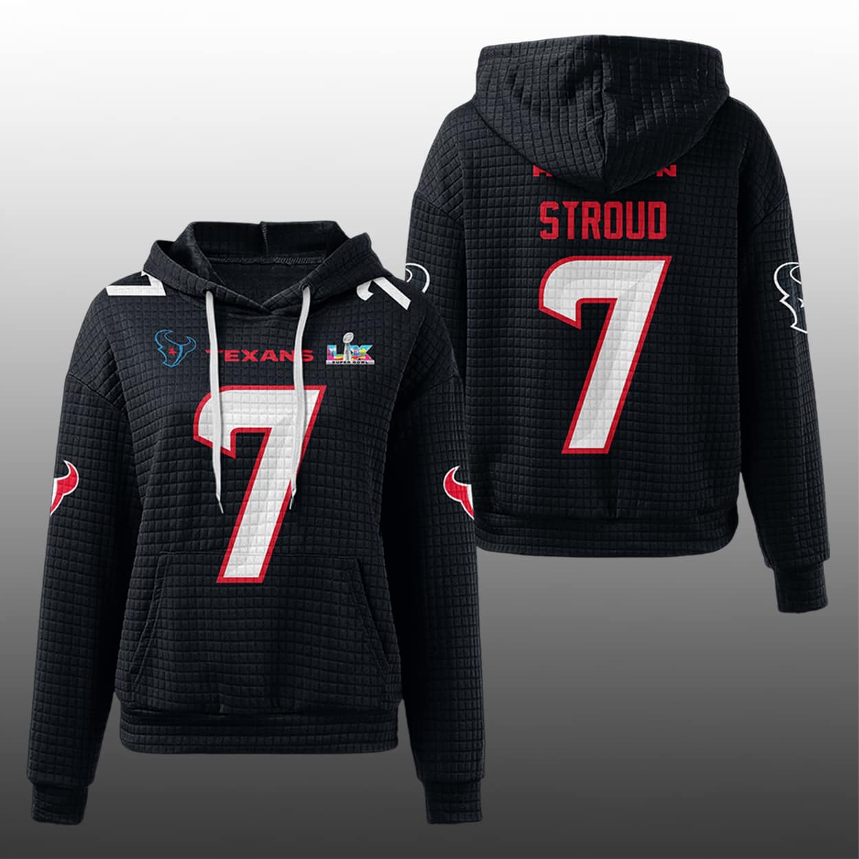 Turn heads and rep Houston pride with the Texans C.J. Stroud 7 SB LX Waffle Hoodie—a bold blend of swagger, spirit, and Super Bowl energy.