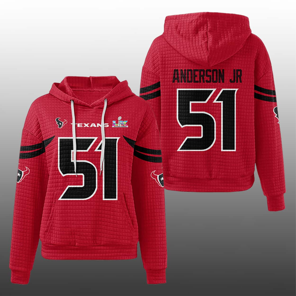 Step into beast mode with this hoodie, a bold tribute to Houston’s defensive dynamo. This hoodie packs a kick with Anderson Jr.’s number 51 blazing across the front and back in red and blue outlined digits. “ANDERSON JR” sits proudly above the back number, while the Texans logo charges forward on both sleeves. Red accents on the hood and drawstrings add a fiery contrast, and the SB LX patch on the chest seals the deal—because champions don’t just play, they dominate.