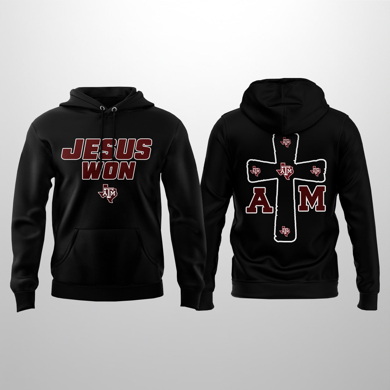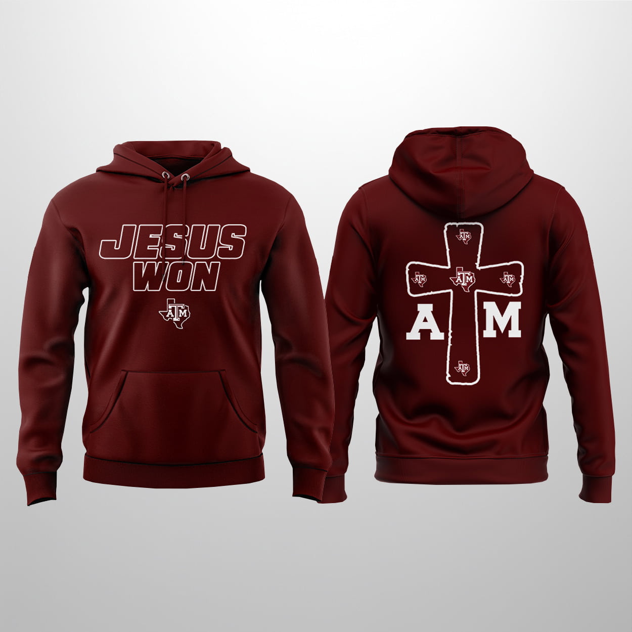 This hoodie is more than just game-day gear—it’s a bold proclamation of faith and fandom. On the front, “JESUS WON” stands tall in red and white, backed by the unmistakable Texas A&M logo. Flip it around and you’ll find a powerful cross design adorned with multiple Aggie emblems, flanked by the letters “A” and “M” in matching colors. This hoodie doesn’t whisper—it shouts your values and your team spirit.
