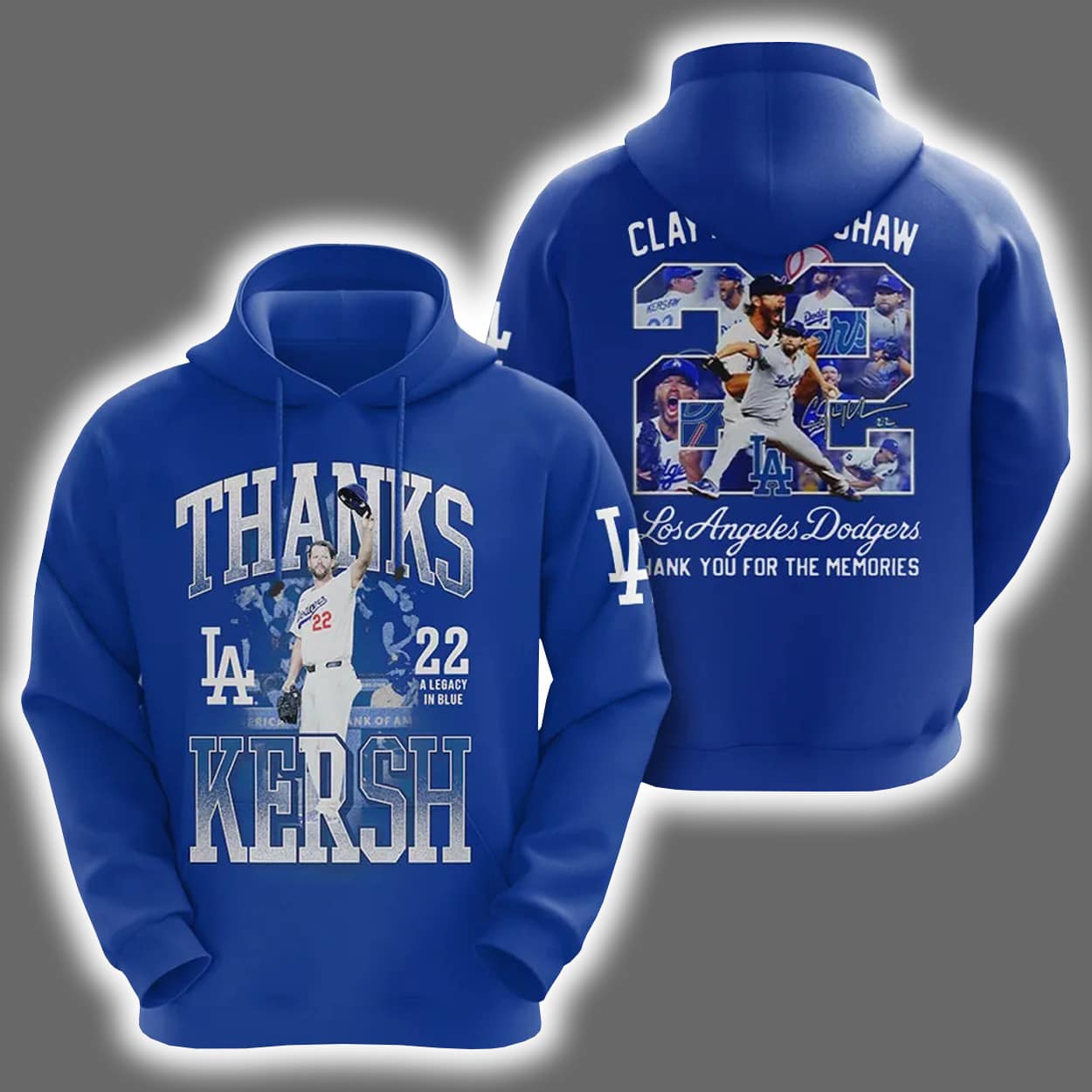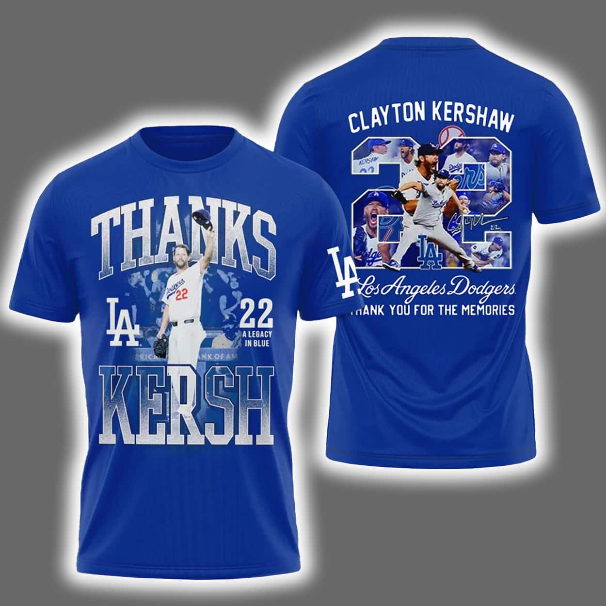 Celebrate a career that defined an era with this shirt. This shirt is a fan’s love letter to one of baseball’s greatest pitchers. On the front, bold white text reads “THANKS KERSH,” flanked by the Dodgers logo and Kershaw’s iconic number 22. A dynamic image of Kershaw mid-pitch captures his signature intensity. Flip it around and the tribute continues: “CLAYTON KERSHAW” crowns a large number 22 filled with action shots from his legendary career. Beneath it, “Los Angeles Dodgers” in script and “THANK YOU FOR THE MEMORIES” in all caps seal the sentiment.