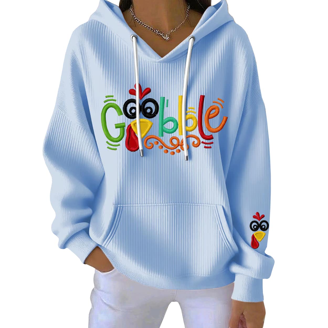 This isn’t just about turkey—it’s about personality. The hoodie blends humor, warmth, and seasonal spirit into one wearable celebration. The cartoon turkey is a nod to childhood nostalgia, while the bold “Gobble” lettering invites smiles and conversation. It’s designed for those who don’t just show up to the party—they bring the party with them.