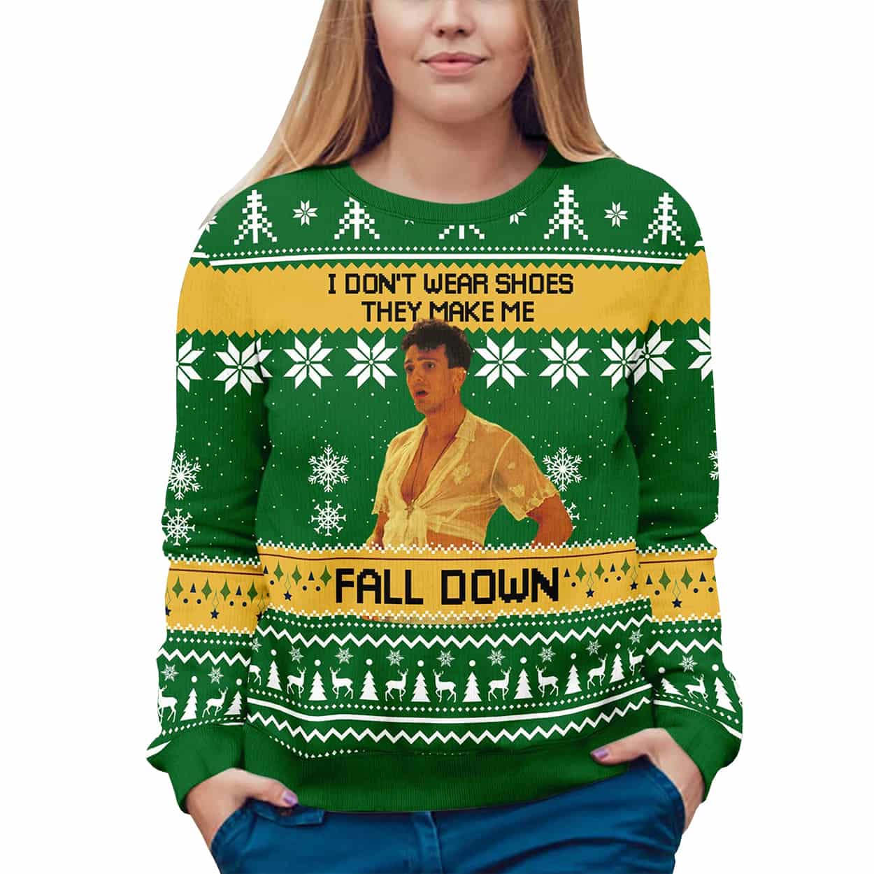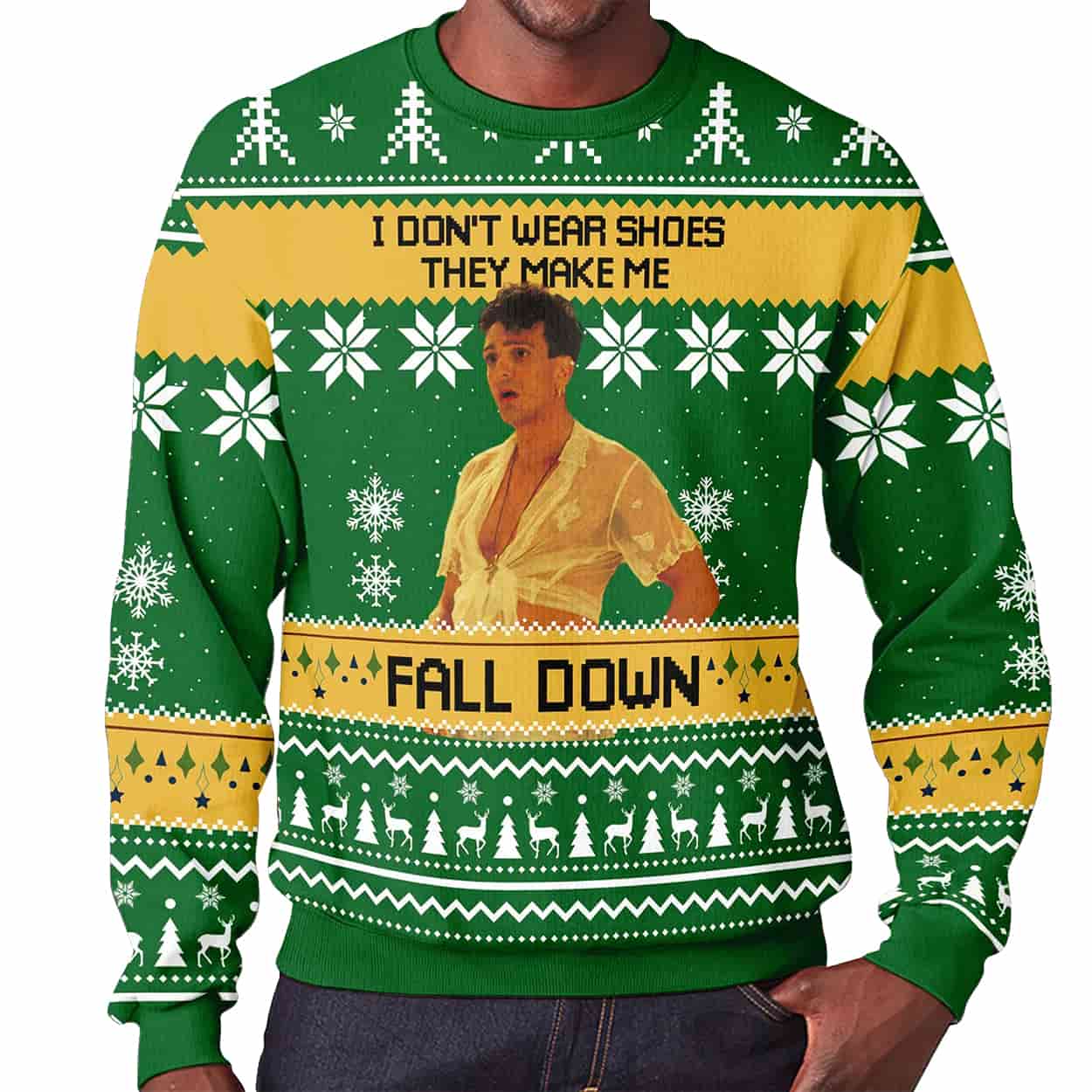 This isn’t just an ugly Christmas sweater—it’s a full-on theatrical entrance. Featuring a vibrant green, yellow, and white palette, this festive knit showcases Agador Spartacus from The Birdcage in his most iconic moment: arms flailing, balance betrayed, and sass fully intact. Above his expressive pose, the sweater reads, “I DON’T WEAR SHOES THEY MAKE ME,” and below, the punchline lands: “FALL DOWN.” Surrounded by classic holiday motifs like snowflakes, reindeer, and geometric patterns, this sweater blends campy humor with seasonal cheer, making it the ultimate conversation starter at any holiday gathering.