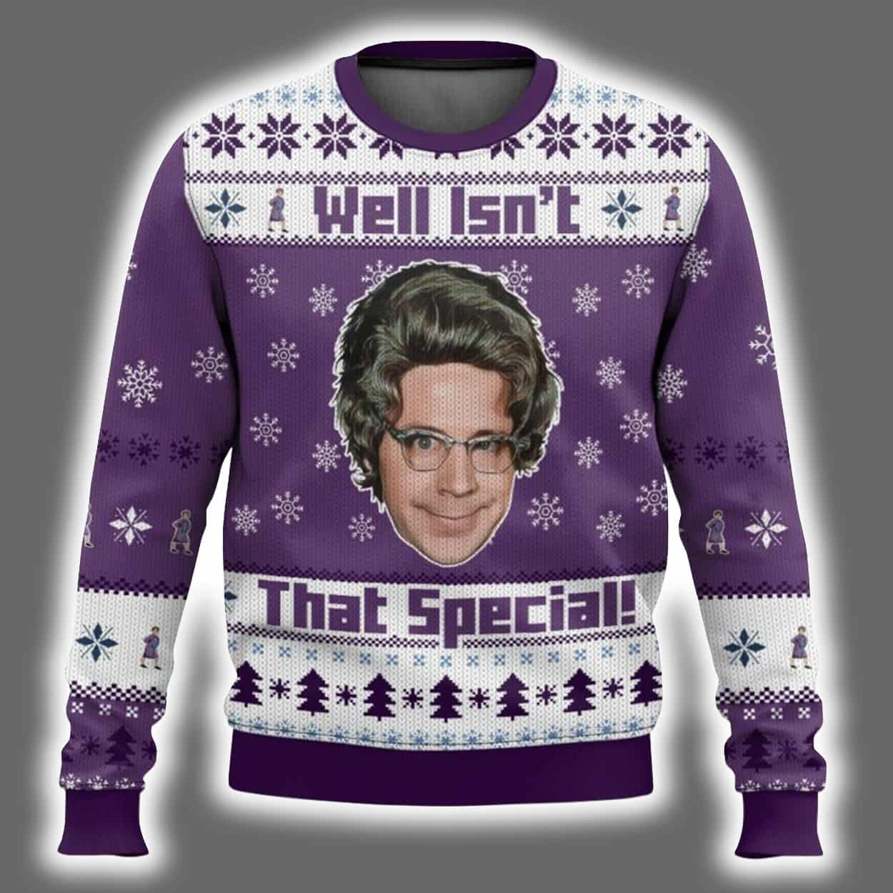 Step into the holiday season with a sweater that’s as cheeky as it is charming. This eye-catching Christmas sweater features a vibrant purple background sprinkled with festive snowflakes and tree patterns in white, blue, and pink. Front and center is the unmistakable face of the Church Lady—complete with glasses and perfectly coiffed hair—delivering her iconic line: “Well Isn’t That Special!” in bold lettering above and below her image. Whether you’re attending an ugly sweater party or just want to spread some satirical cheer, this design guarantees laughs and knowing nods from fellow SNL fans.