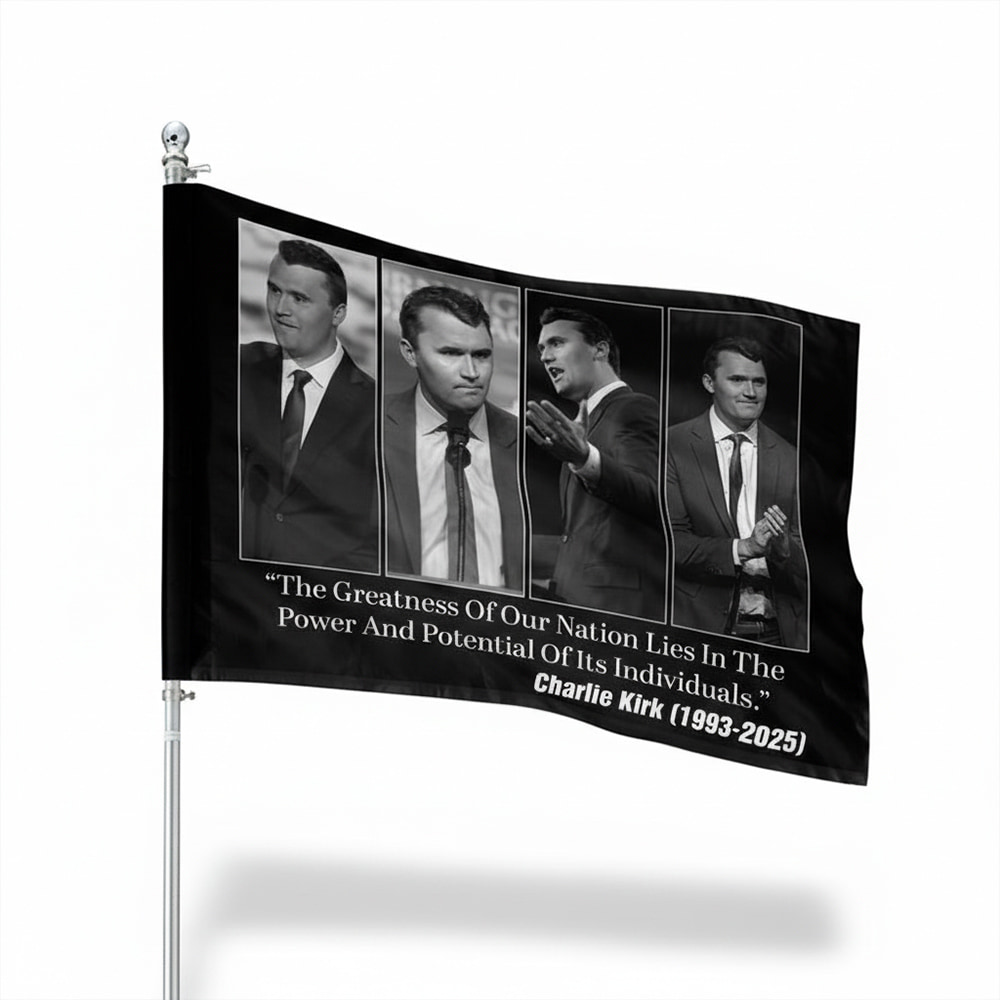 Make a statement that waves louder than words. This flag showcases four black-and-white portraits of Charlie Kirk—each capturing a different pose and persona, from contemplative to commanding. Beneath the images, a powerful quote reads: “The Greatness Of Our Nation Lies In The Power And Potential Of Its Individuals.” It’s not just decoration—it’s a declaration. The inclusion of Kirk’s birth and speculative death year (1993–2025) adds a provocative twist, sparking curiosity and conversation wherever it flies.