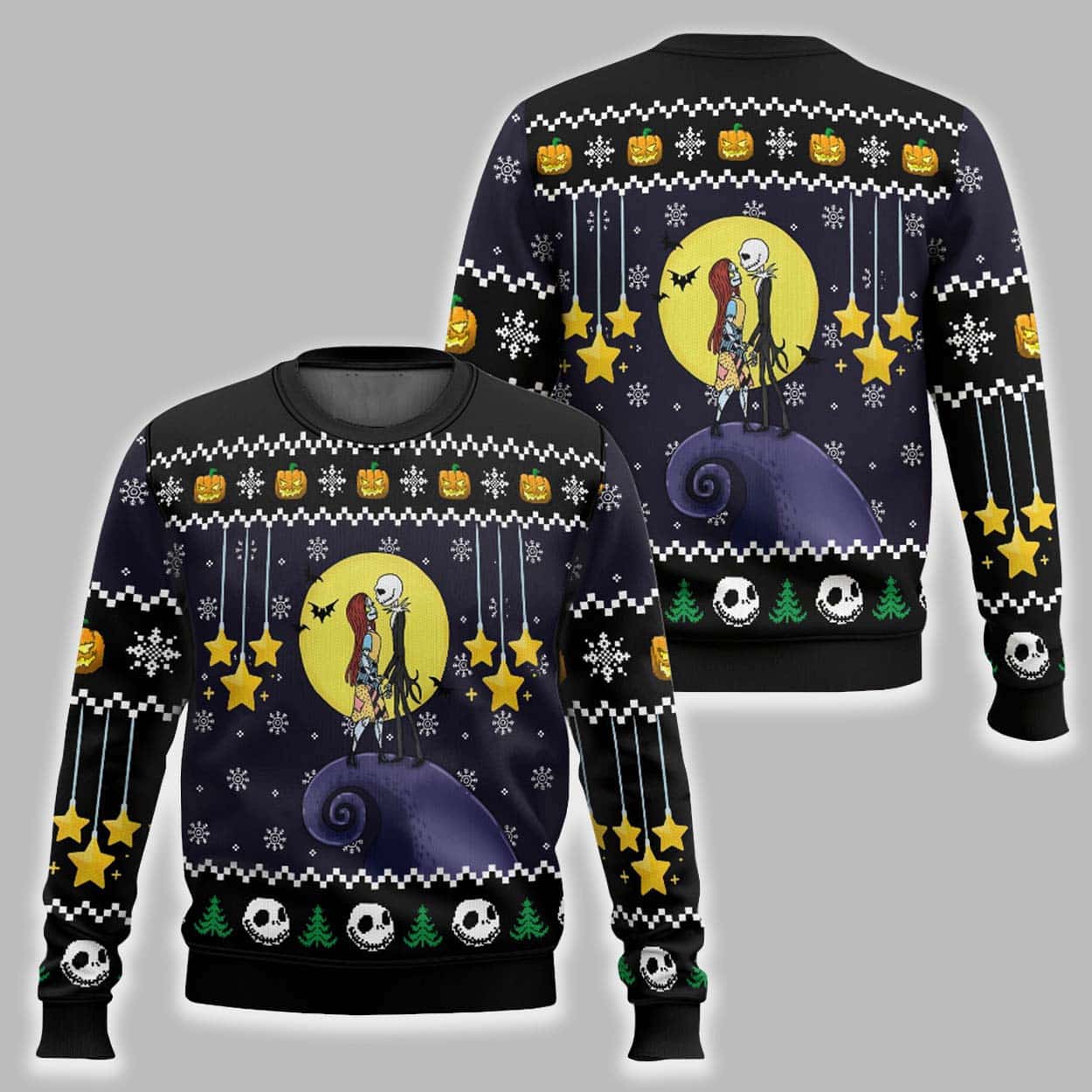 Celebrate the holidays with this The Nightmare Before Romantic Moment Ugly Christmas Sweater. This pullover features the iconic moment of Jack and Sally on Spiral Hill. Blending Halloween and Christmas, it’s covered in jack-o’-lanterns, snowflakes, and festive patterns. It’s the perfect, magical, and cozy sweater for any fan of the film.