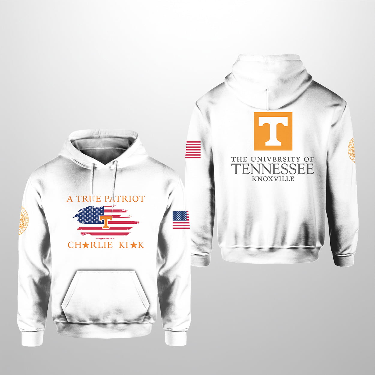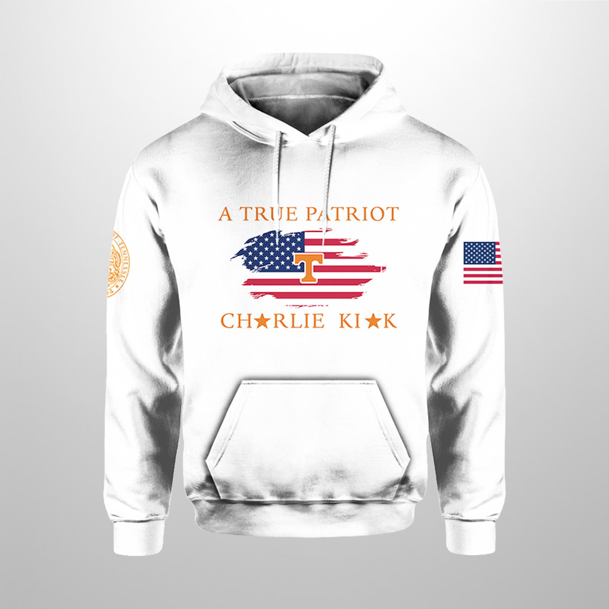 This hoodie is a statement-maker from every angle. On the front, “A TRUE PATRIOT” stands tall in blue above a stylized American flag, with “CHARLIE KIRK” printed in bold red below—flanked by two gold stars that add a touch of flair. The right sleeve features a circular gold emblem, while the left sleeve proudly displays the American flag. Turn it around and you’ll find the unmistakable orange “T” logo of the University of Tennessee Knoxville above its full name, with the same sleeve details completing the look. It’s a hoodie that blends collegiate pride with a clear message of conviction.