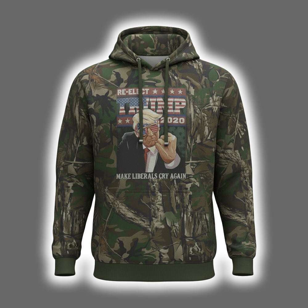 This isn’t just a shirt—it’s a declaration. The Thomas Jacob Sanford Re-elect Trump 2020 Camouflage Shirt features a striking graphic of a blonde-haired man in American flag sunglasses, fist raised in defiance. Above him, the rallying cry “RE-ELECT TRUMP 2020” blazes across a stars-and-stripes backdrop. Below, the unapologetic slogan “MAKE LIBERALS CRY AGAIN” seals the message. Set against a military-style camo print, this shirt blends rugged Americana with political bravado.