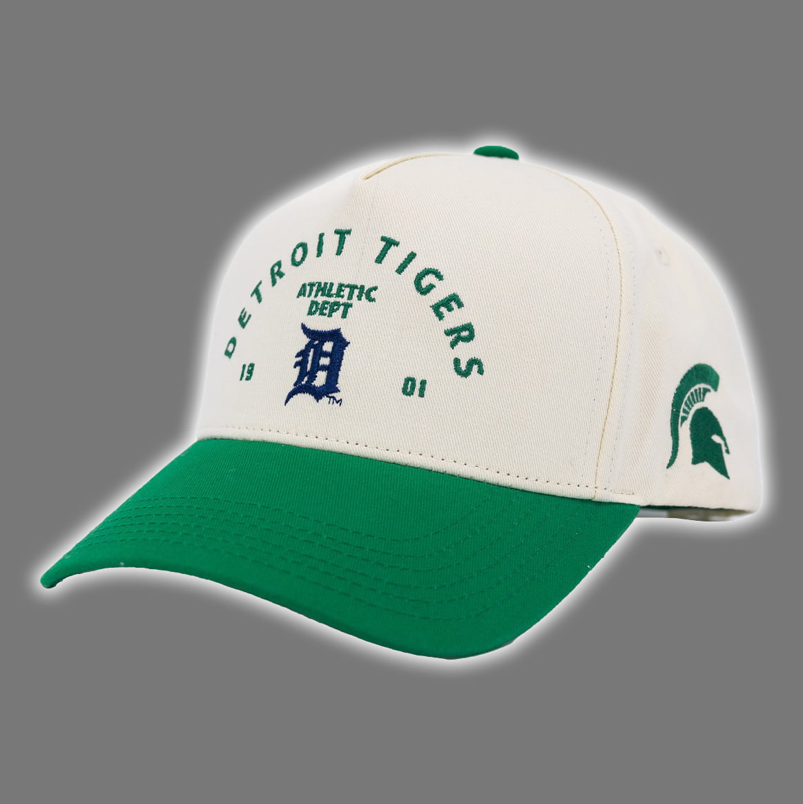 Step up your fan gear with the Tigers Michigan State University Hat Giveaway 2025, a item sensation! This cap boasts a cream-colored crown paired with a vibrant green bill, embodying the perfect fusion of Detroit Tigers and Michigan State University spirit. The front proudly displays “DETROIT ATHLETIC DEPT” in playful green lettering, arcing over a bold navy blue “D” logo, with “19” and “01” on either side—nodding to the Tigers’ legacy. On the side, a green Spartan helmet logo stands tall, representing MSU’s fierce pride. This hat is ideal for game days, campus strolls, or casual outings, making it a must-have for Tigers fans and Spartans alike.