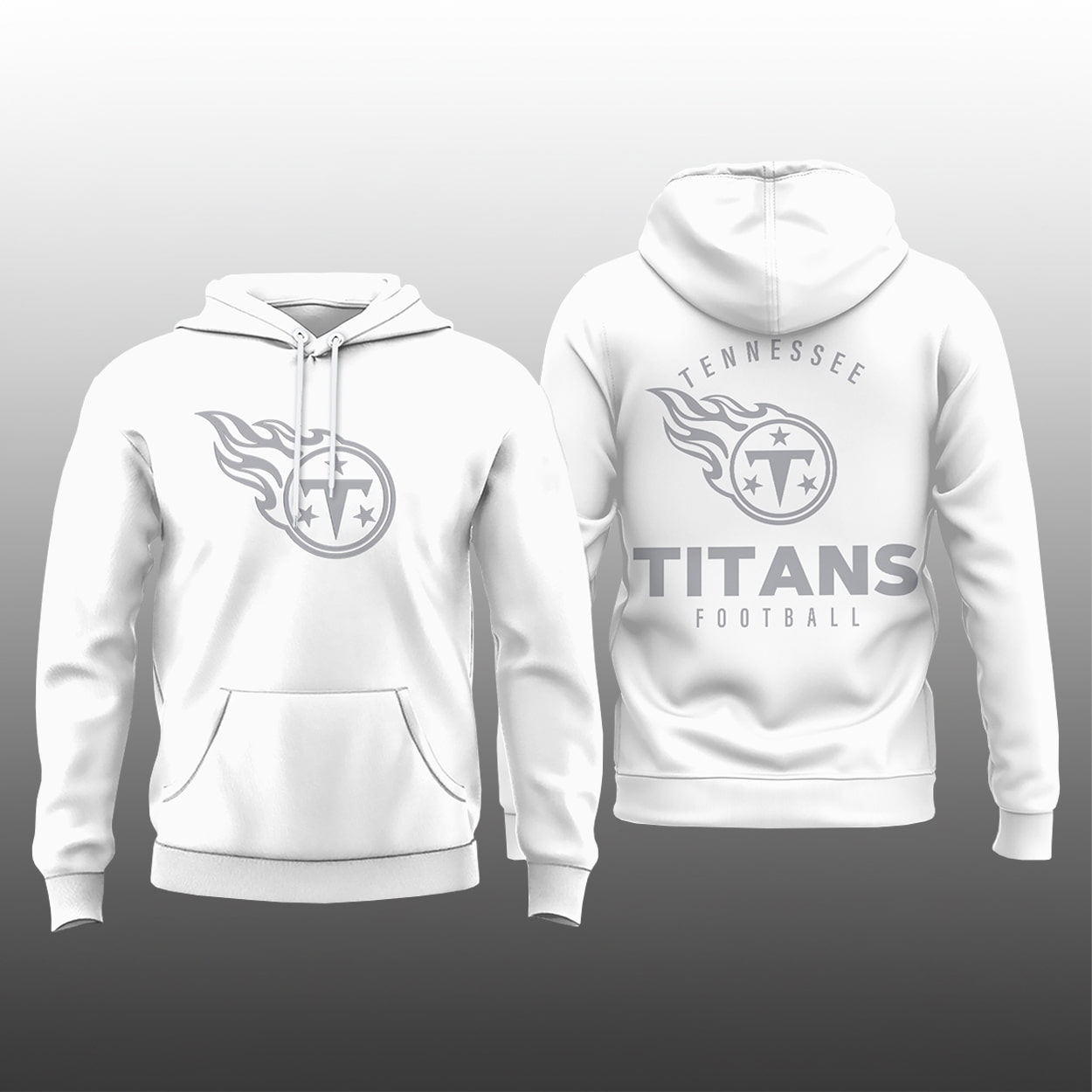 Step into the fire with this set—a sleek, all-white collection that turns heads while keeping your loyalty front and center. This set includes two hoodies, joggers, and a cap, each featuring the Titans’ signature flaming “T” logo in a cool monochromatic gray. One hoodie keeps it minimalist with the logo on the chest, while the other makes a bold statement with “TITANS FOOTBALL” stacked around the emblem on the back. The joggers carry the logo on the thigh for a subtle nod to your allegiance, and the cap finishes the look with clean precision. Whether you’re rallying at the stadium or cruising through the city, this set delivers effortless style with unmistakable Titans energy.