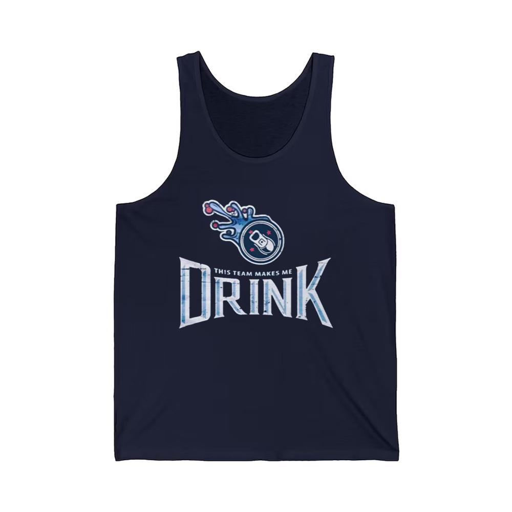 Introducing the ultimate mood tee for Tennessee Titans fans who’ve felt every high, low, and questionable fourth-down call. This shirt features a bold graphic: a flaming thumbtack-inspired logo followed by the unapologetic phrase “THIS TEAM MAKES ME DRINK.” The word “DRINK” steals the spotlight with a distressed, oversized font—because let’s face it, some Sundays require more than just team spirit. Whether you’re at the stadium, your local bar, or pacing your living room, this shirt lets everyone know exactly where you stand: loyal, frustrated, and always ready to toast.