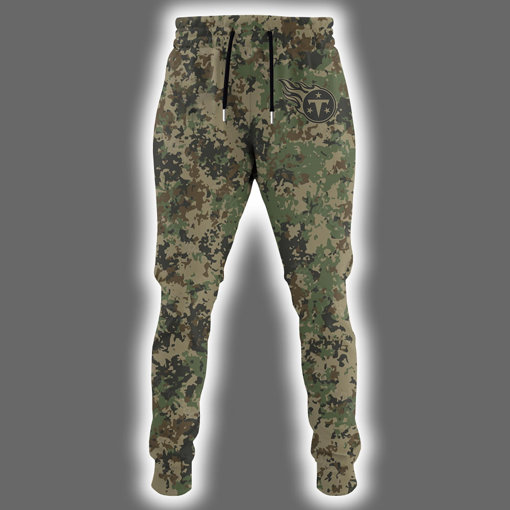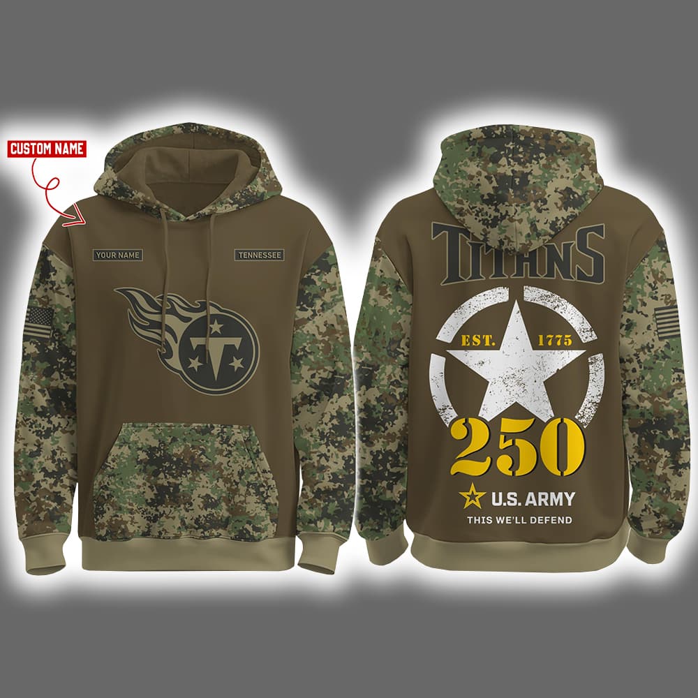 Step into the spotlight with the Titans US Army 250th Birthday Celebration Night Game 2025 Hoodie Joggers Cap—a bold fusion of battlefield grit and football glory. The hoodie features a striking olive green upper body paired with camo sleeves and lower torso, creating a look that’s equal parts tactical and stylish. On the front, the Titans’ flame logo blazes beneath two name tags: one customizable with your name, the other stamped “TITANS.” The right sleeve proudly displays the American flag patch, while the back delivers a powerful visual punch—“TITANS” in bold lettering, a white star emblem with “EST. 1775” in yellow, and the number “250” blazing across the center. Beneath it, the motto “U.S. ARMY – THIS WE’LL DEFEND” anchors the design with purpose. The joggers echo the camo and olive green palette with matching graphics, and the cap completes the look with Titans and military insignia that says: “I’m here to win—and honor.”