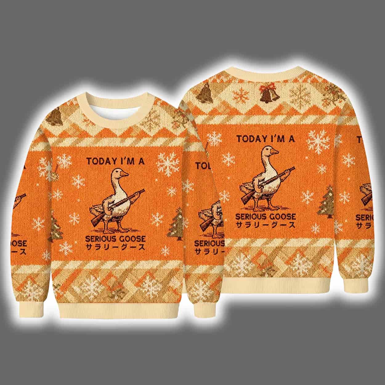 This isn’t your average holiday sweater—it’s a full-on honk of authority. Dominating both the front and back is a determined goose gripping a guitar like it’s about to drop the most intense solo of the season. Above the goose, the phrase “TODAY I’M A SERIOUS GOOSE” is boldly printed in English and Japanese (サラリーグース), adding an international flair to its already eccentric vibe. The background bursts with holiday spirit: snowflakes, Christmas trees, and geometric patterns in beige, white, and orange tones, all arranged in a symmetrical, eye-catching layout.