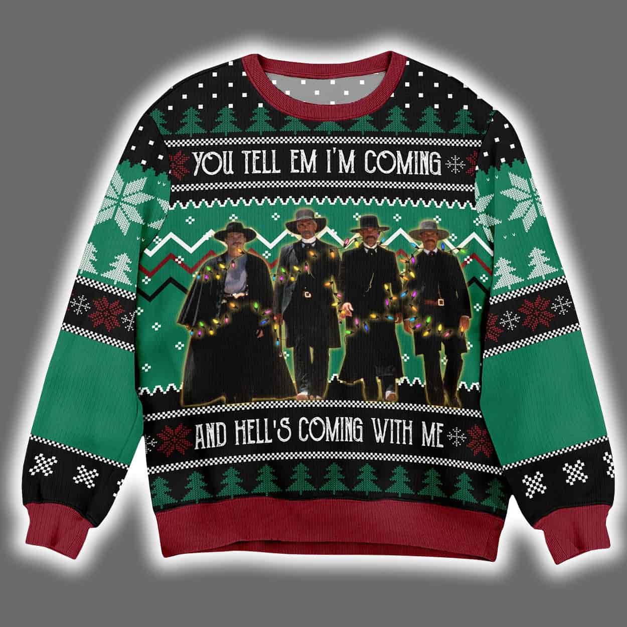 Bring the Wild West to your winter wardrobe with the Tombstone You Tell Em I’m Coming And Hell’s Coming With Me Ugly Christmas Sweater—a festive fusion of holiday cheer and cinematic grit.