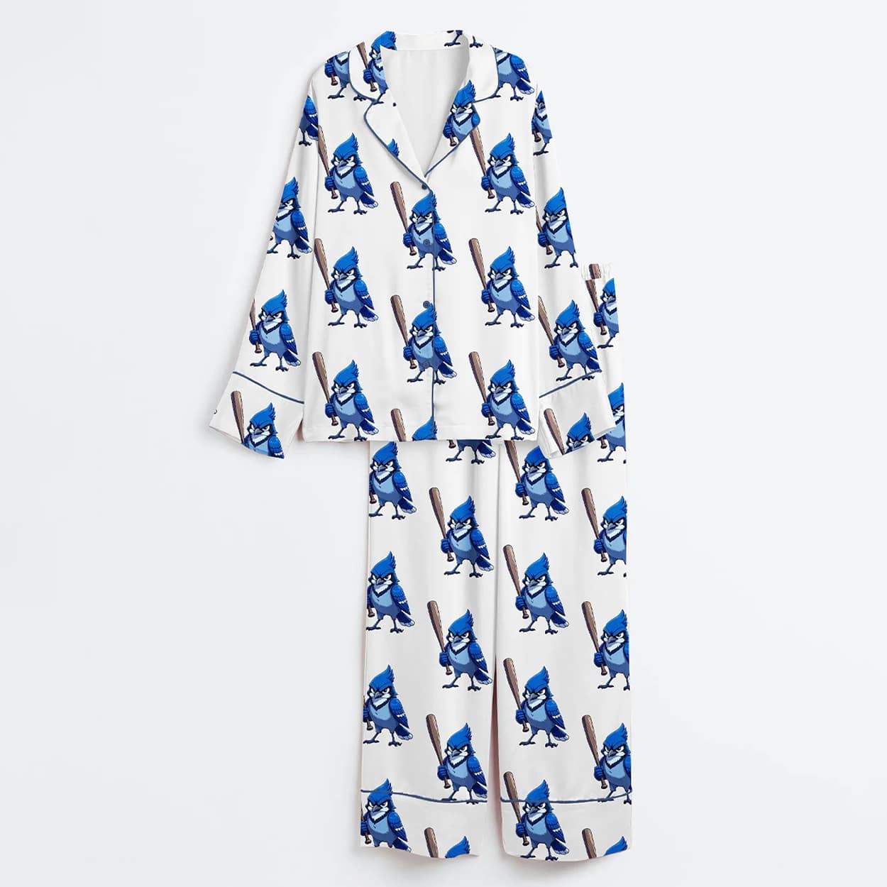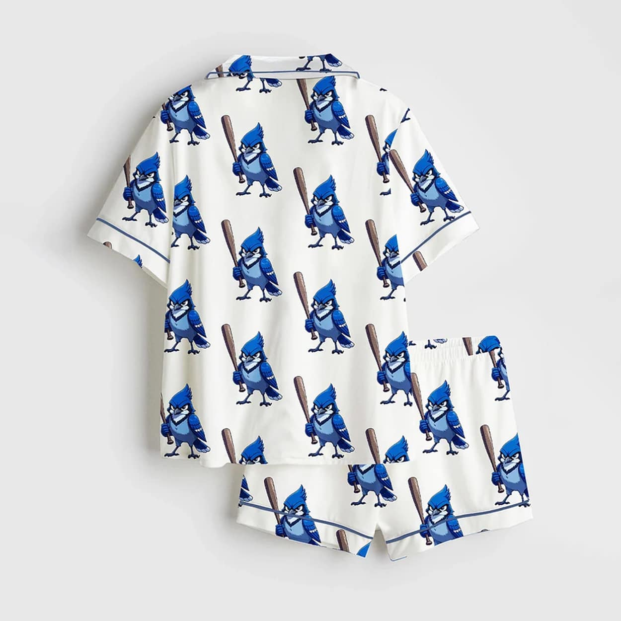 Step up to the plate in style with this set. This dynamic two-piece includes a short-sleeved button-up shirt and matching shorts, both covered in a lively repeat pattern of a cartoon blue jay character wielding a baseball bat. Each blue jay is decked out in a sporty blue cap and ready to swing, bringing a burst of energy and attitude to your bedtime look. The crisp white background and sleek black piping add a polished contrast, making this set perfect for lounging, game-day mornings, or just showing off your love for the sport.