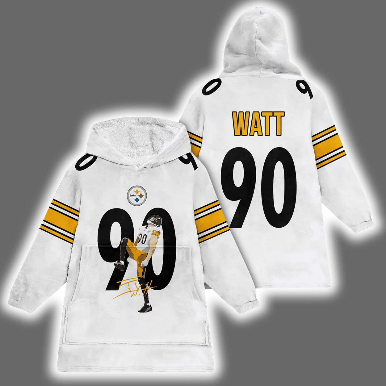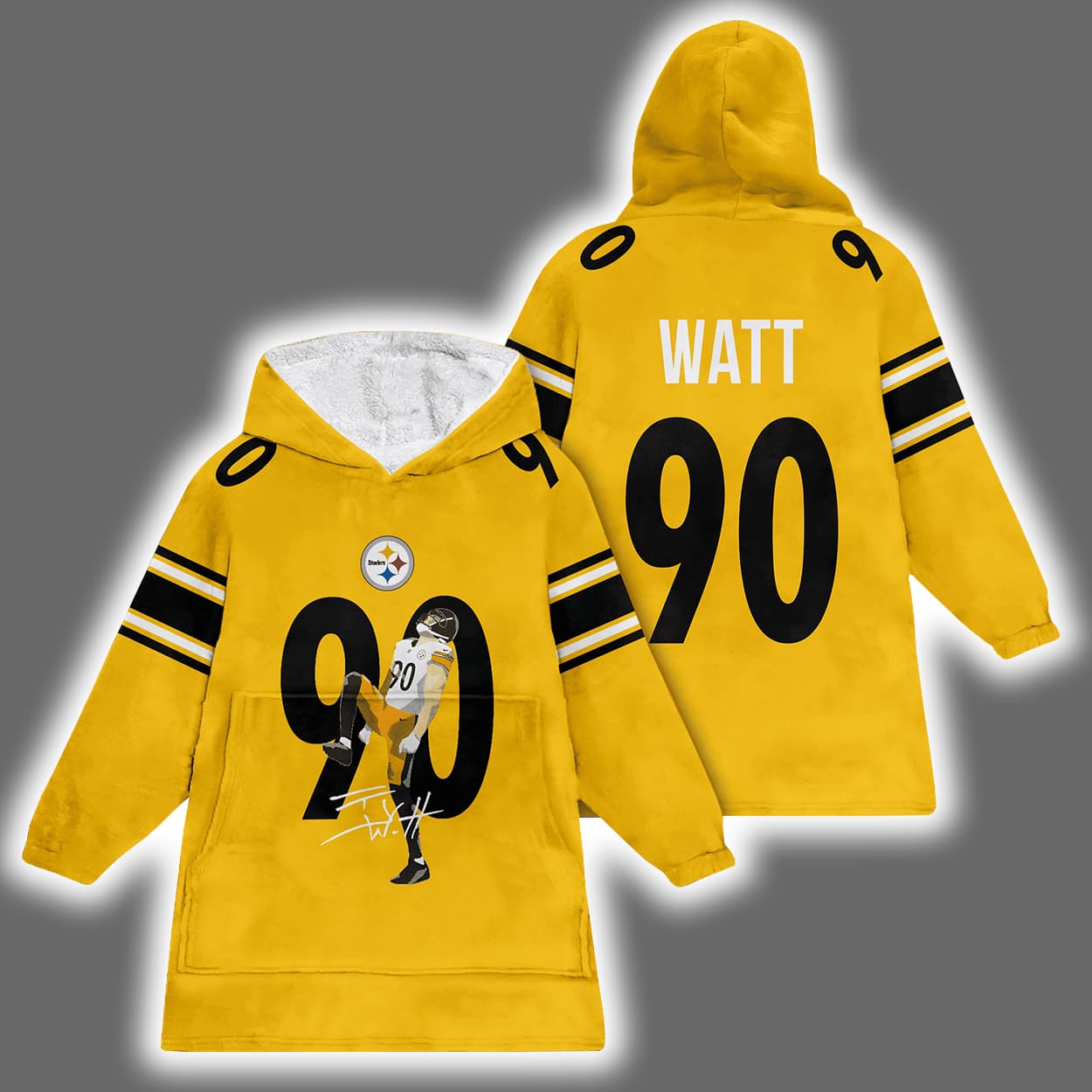 Get ready to tackle chilly days with the electrifying energy of T.J. Watt! This blanket hoodie is a touchdown in comfort and style, featuring a vibrant yellow base that screams Steelers pride. On the front, Watt’s iconic number “90” dominates in bold black, with an action-packed illustration of the man himself bursting through the digits like he’s breaking through the offensive line. Above it, the classic Steelers logo adds a stamp of fandom. Flip it around and you’ll find “WATT” printed loud and proud across the shoulders, right above the number 90 — a back view that’s all about swagger. Black and white stripes on the sleeves bring a sporty edge that says, “Game on!”
