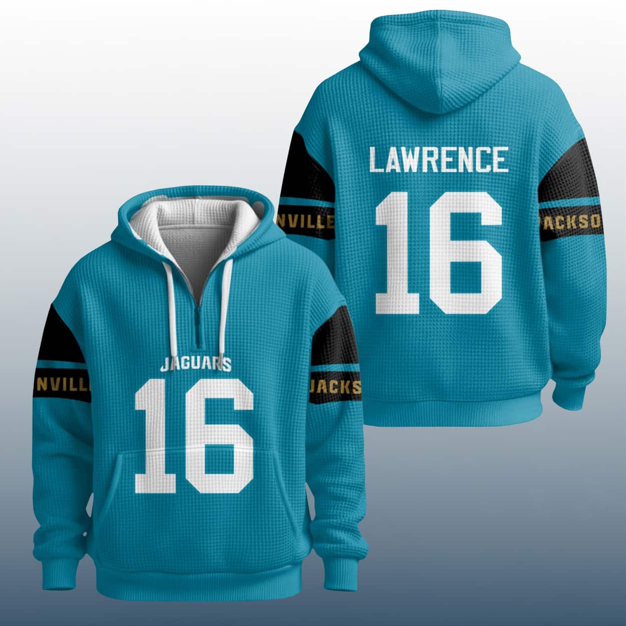 Be the first to review “Trevor Lawrence 16 Jaguars Quarter Zip Waffle Hoodie” Cancel reply