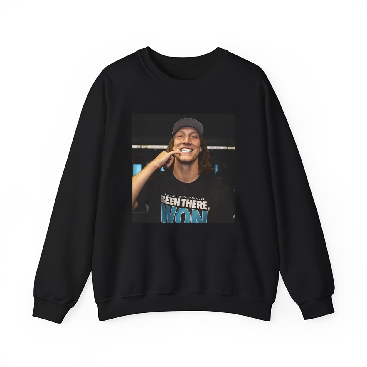 This shirt isn’t just merch — it’s a moment frozen in time. Featuring a high-energy photo of Trevor Lawrence mid-celebration, flashing his grillz and pointing to his smile, this tee captures the exact second the Jaguars locked up the AFC South. The bold “BEEN THERE, WON” text across his shirt in the image adds the perfect punchline to a victory that fans will never forget. It’s loud, proud, and unmistakably DUUUVAL.