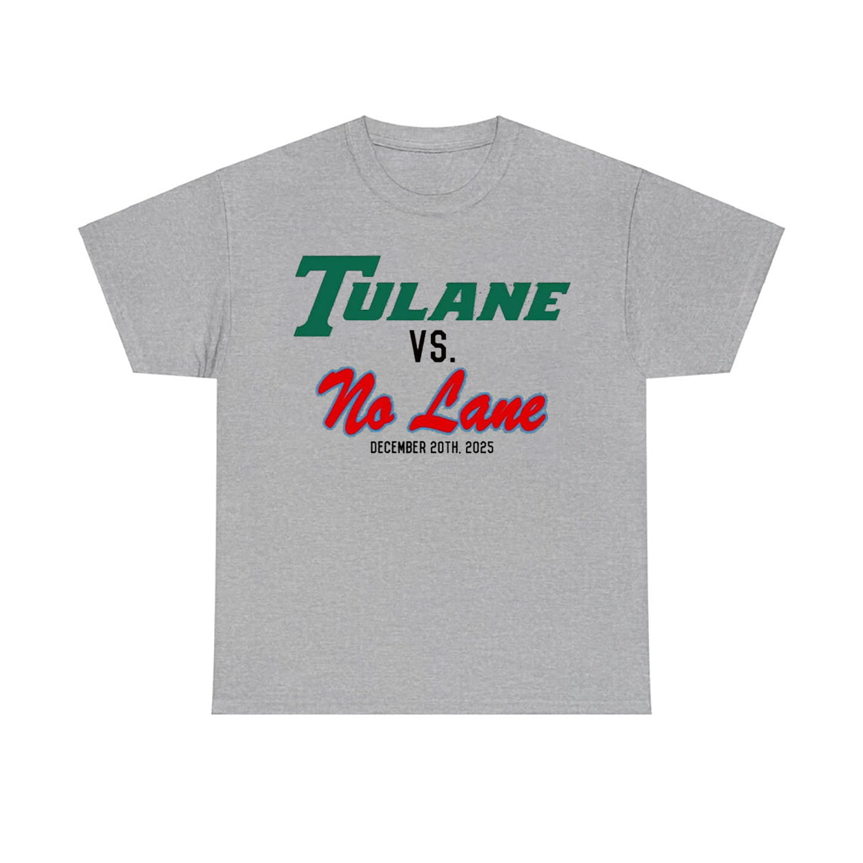 Step into the spotlight with this shirt, a clever and eye-catching tribute to one of the most spirited matchups of the season. Featuring bold green “Tulane” text squaring off against fiery red “No Lane,” this shirt captures the energy of December 20th, 2025. The crisp black date anchors the design, making it not just a shirt, but a wearable memory of a showdown that had fans buzzing.