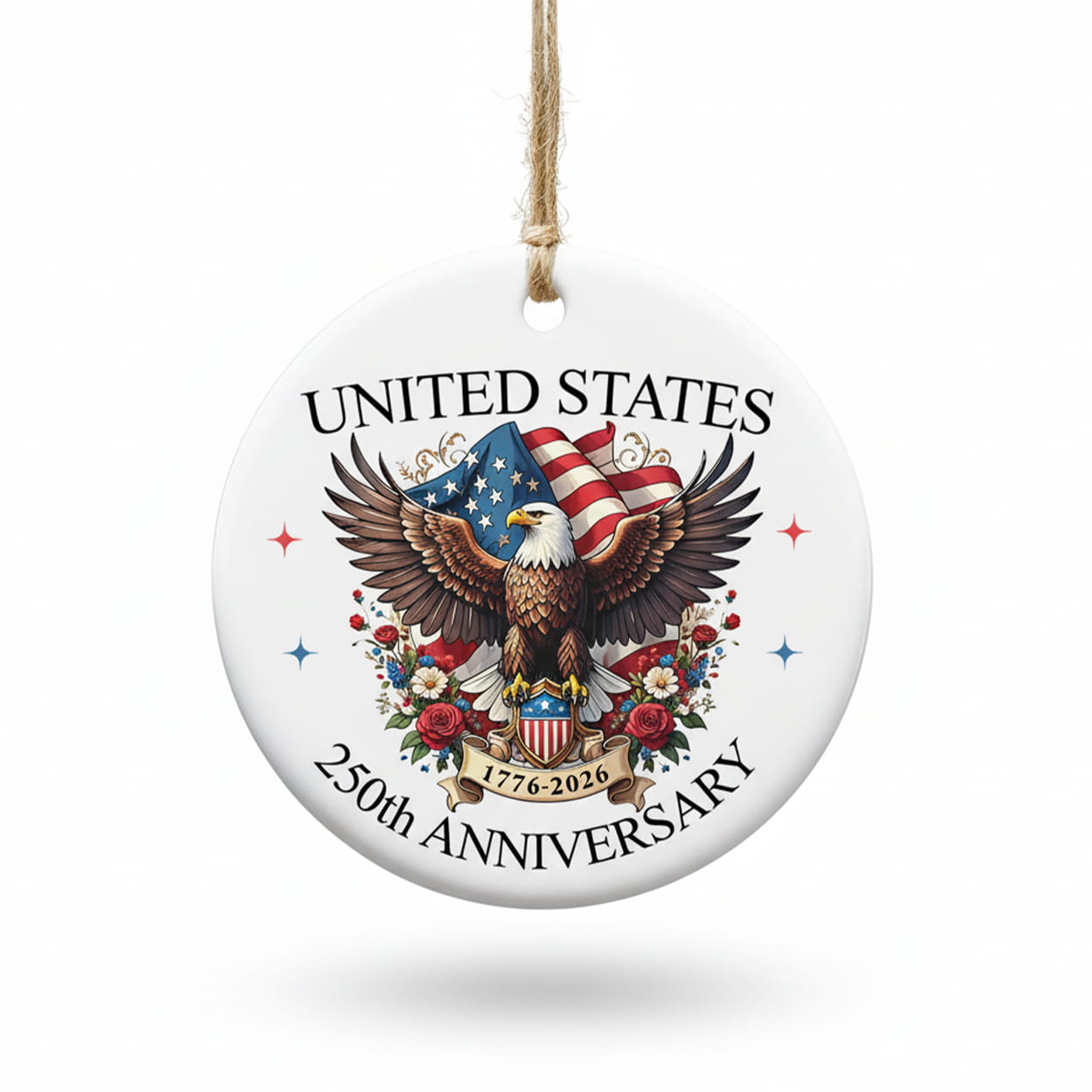 Add a powerful touch of patriotism to your holiday décor with this ornament. This circular keepsake showcases a striking bald eagle mid-flight, wings spread wide in a triumphant pose. Draped in the American flag and clutching a banner that reads “1776–2026,” the eagle is surrounded by a festive burst of red, white, and blue stars and flowers. Above and below, the words “UNITED STATES” and “250th ANNIVERSARY” frame the design, making it clear: this ornament is a celebration of freedom, resilience, and national pride.