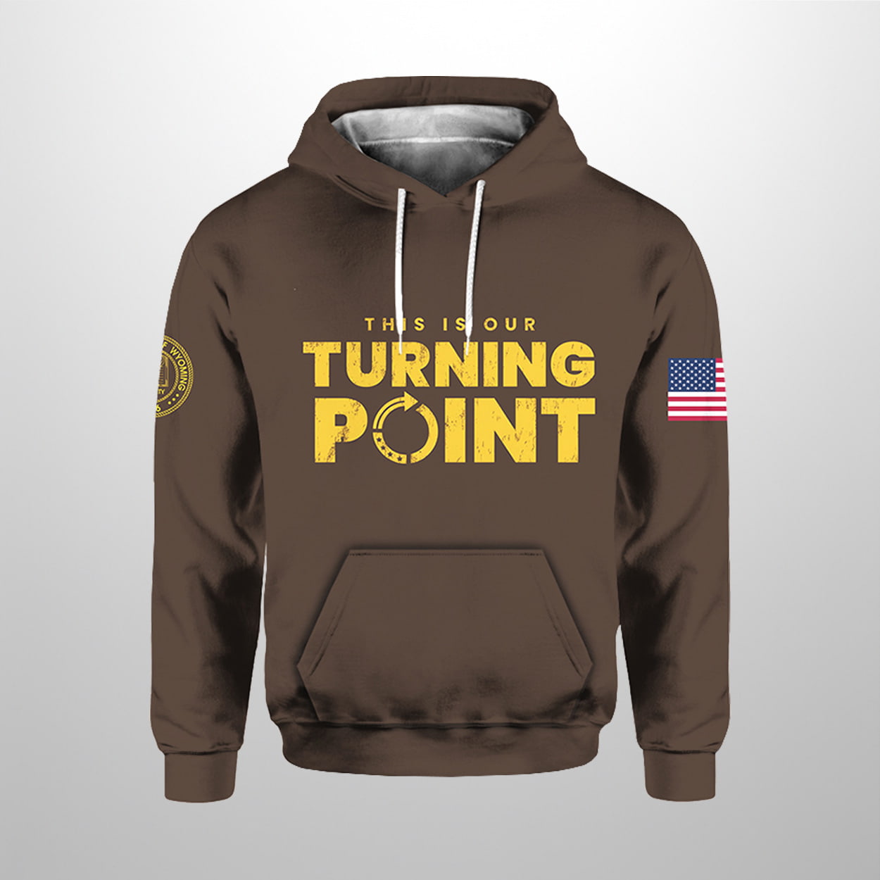 This hoodie is a rally cry you can wear. Dressed in rich brown, the front declares “THIS IS OUR TURNING POINT” in bold yellow and white lettering, setting the tone for change and confidence. A proud American flag patch rides the right sleeve, while a circular yellow emblem adds flair to the left. On the back, a striking graphic of a cowboy riding a bucking horse captures the spirit of the West, with “UNIVERSITY OF WYOMING” stamped below like a seal of honor.