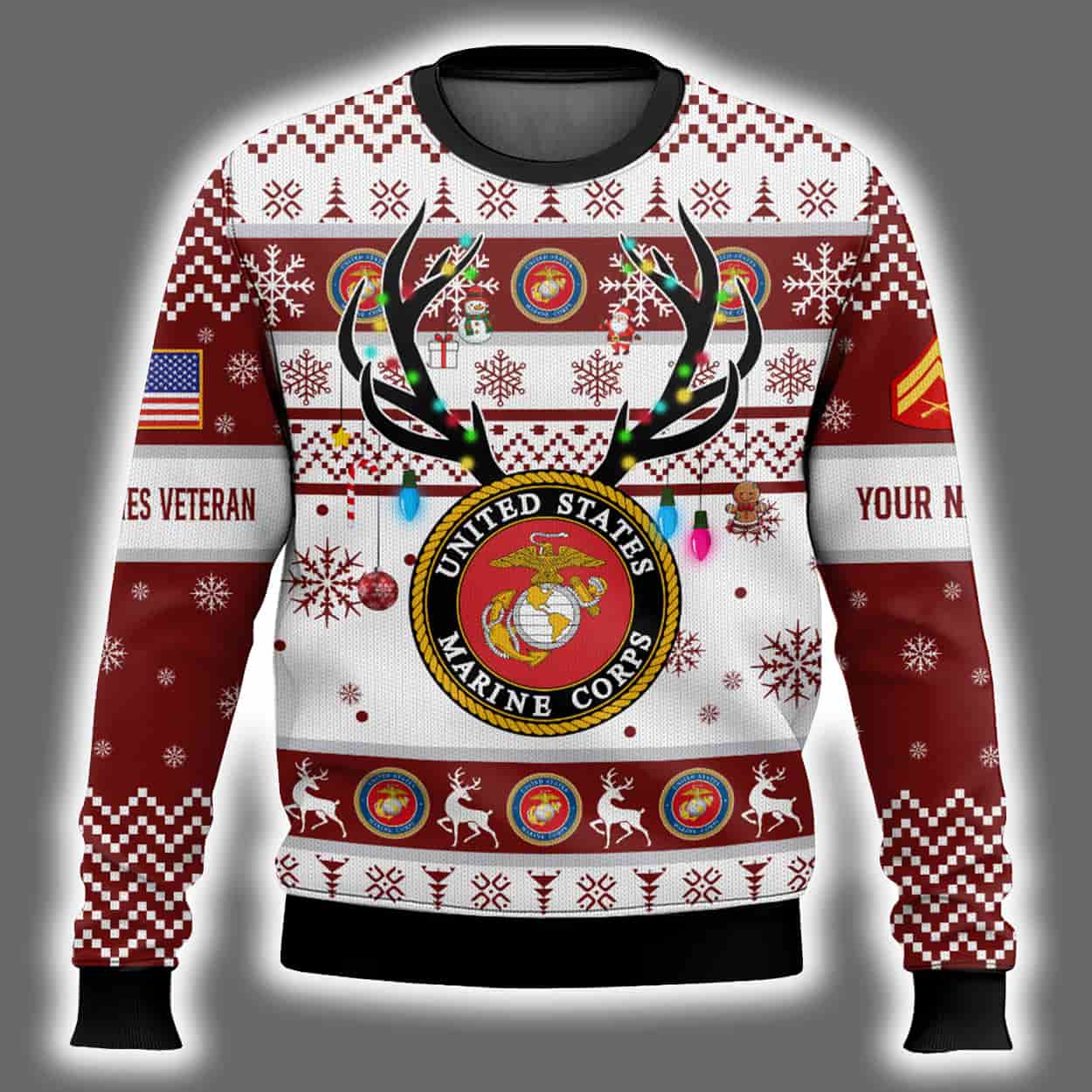 March into holiday cheer with this sweater. This bold, red-and-white design features the Marine Corps emblem front and center, flanked by festive icons like snowflakes, reindeer, and Christmas trees. Patriotic accents line the sleeves with “U.S. MARINE” and “U.S. VETERAN” proudly displayed, while the back delivers a powerful message: “GOD FOUND SOME OF THE STRONGEST MEN AND MADE THEM U.S. MARINES.” With customizable name placement and a design that blends military honor with seasonal joy, this sweater is a standout salute to service.