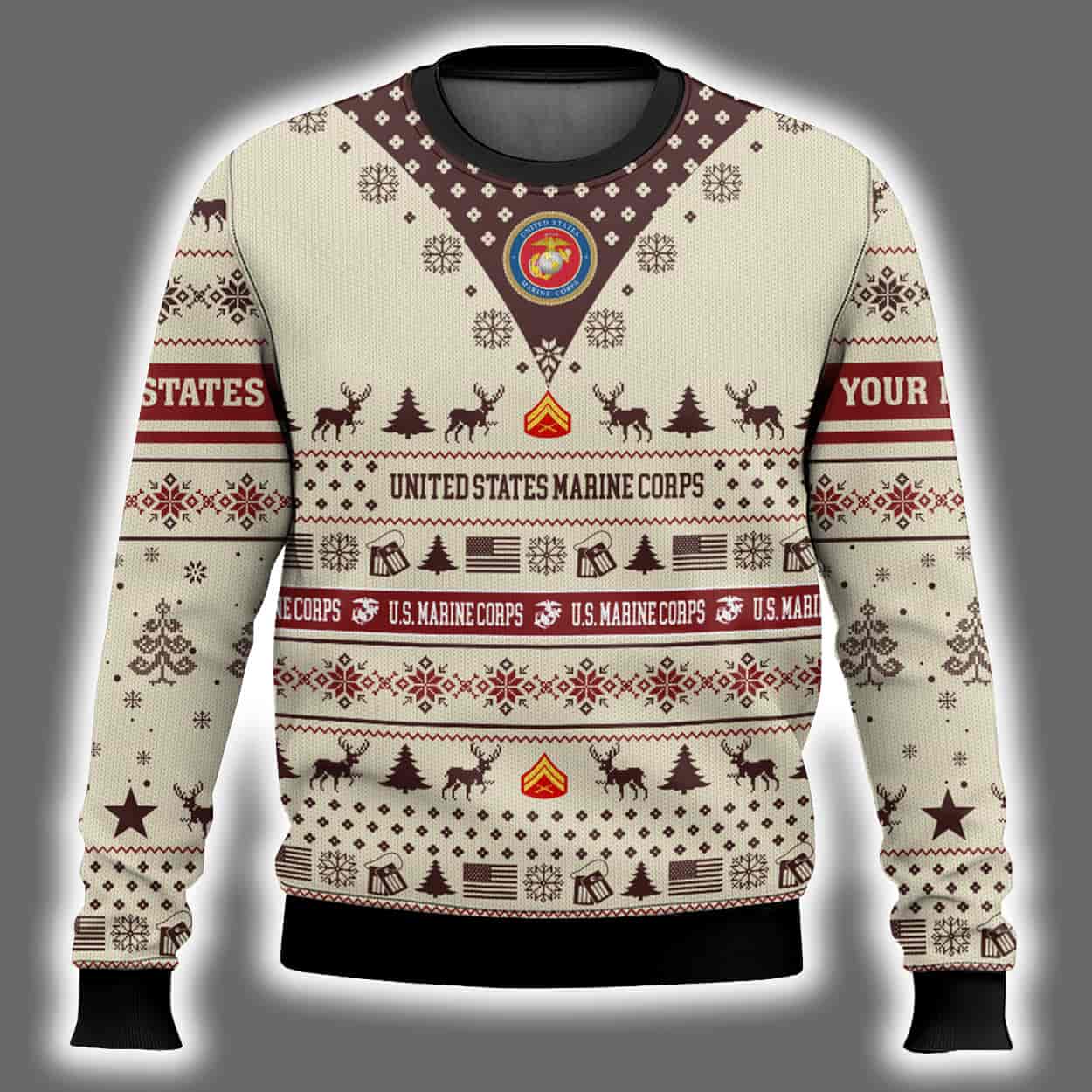 Deck the halls and report for holiday duty in this sweater. This bold and festive garment blends classic Christmas motifs—reindeer, snowflakes, and stars—with unmistakable Marine Corps pride. Front and center sits the iconic USMC emblem, flanked by decorative icons and the proud declaration: “UNITED STATES MARINE CORPS.” The sleeves carry the words “UNITED STATES” and “YOUR NAME,” offering a personalized touch for every warrior. Turn around, and you’ll find five silhouetted Marines standing tall above the heartfelt message: “MERRY CHRISTMAS BROTHERS,” with a nod to 29 Palms, CA—home of the Marine Corps Air Ground Combat Center.