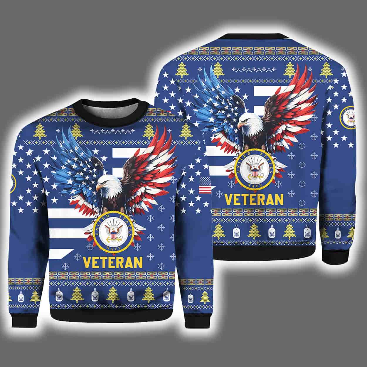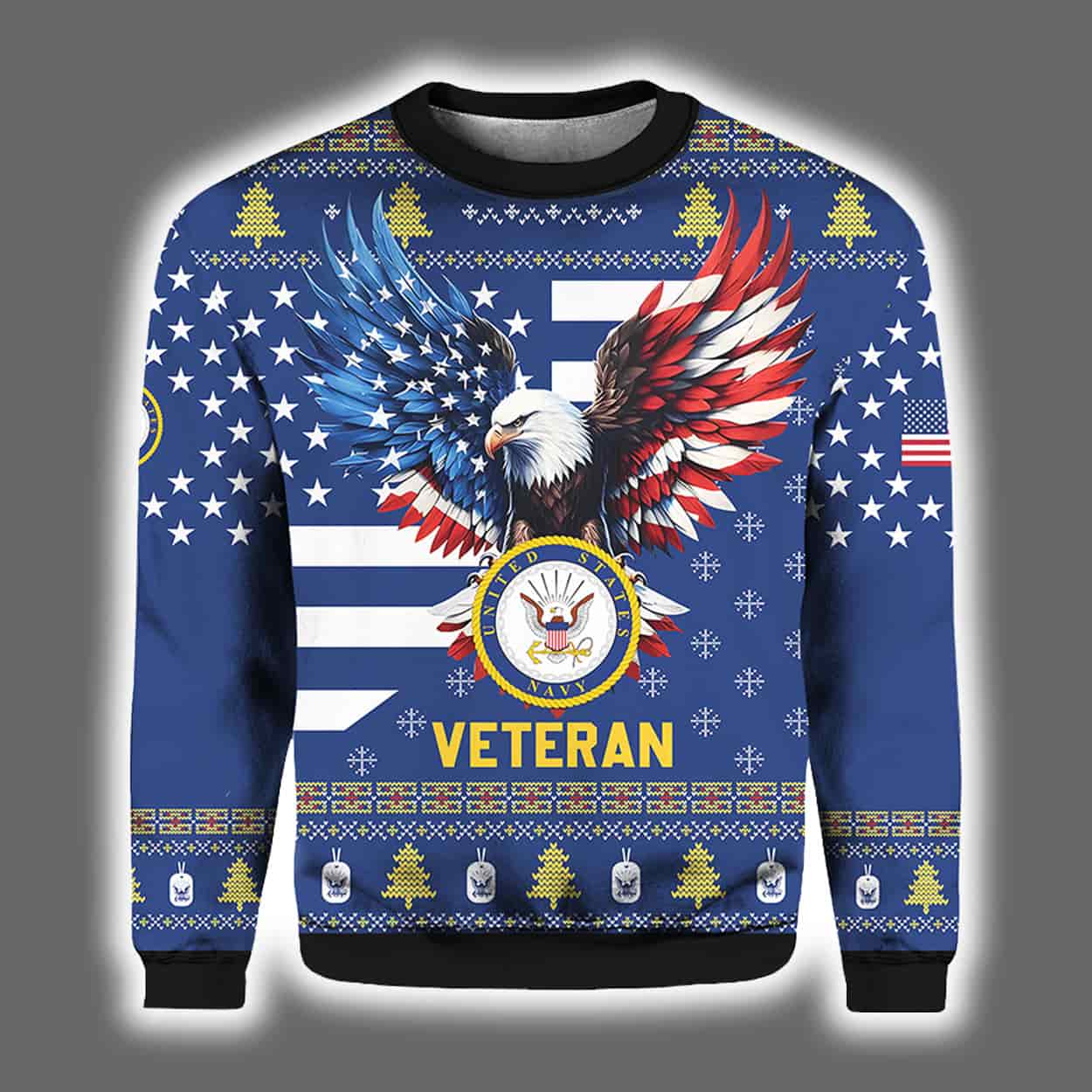 Deck the halls—and yourself—with the ultimate tribute to Navy veterans! This eye-catching sweater proudly showcases a majestic bald eagle with wings spread wide in red, white, and blue glory, soaring above a stylized American flag backdrop. Beneath the eagle, the official U.S. Navy emblem anchors the design, with the word “VETERAN” boldly printed in golden yellow. From festive snowflakes and Christmas trees to Navy insignias on the sleeves, every inch of this sweater salutes 250 years of unwavering service while keeping the holiday spirit alive.