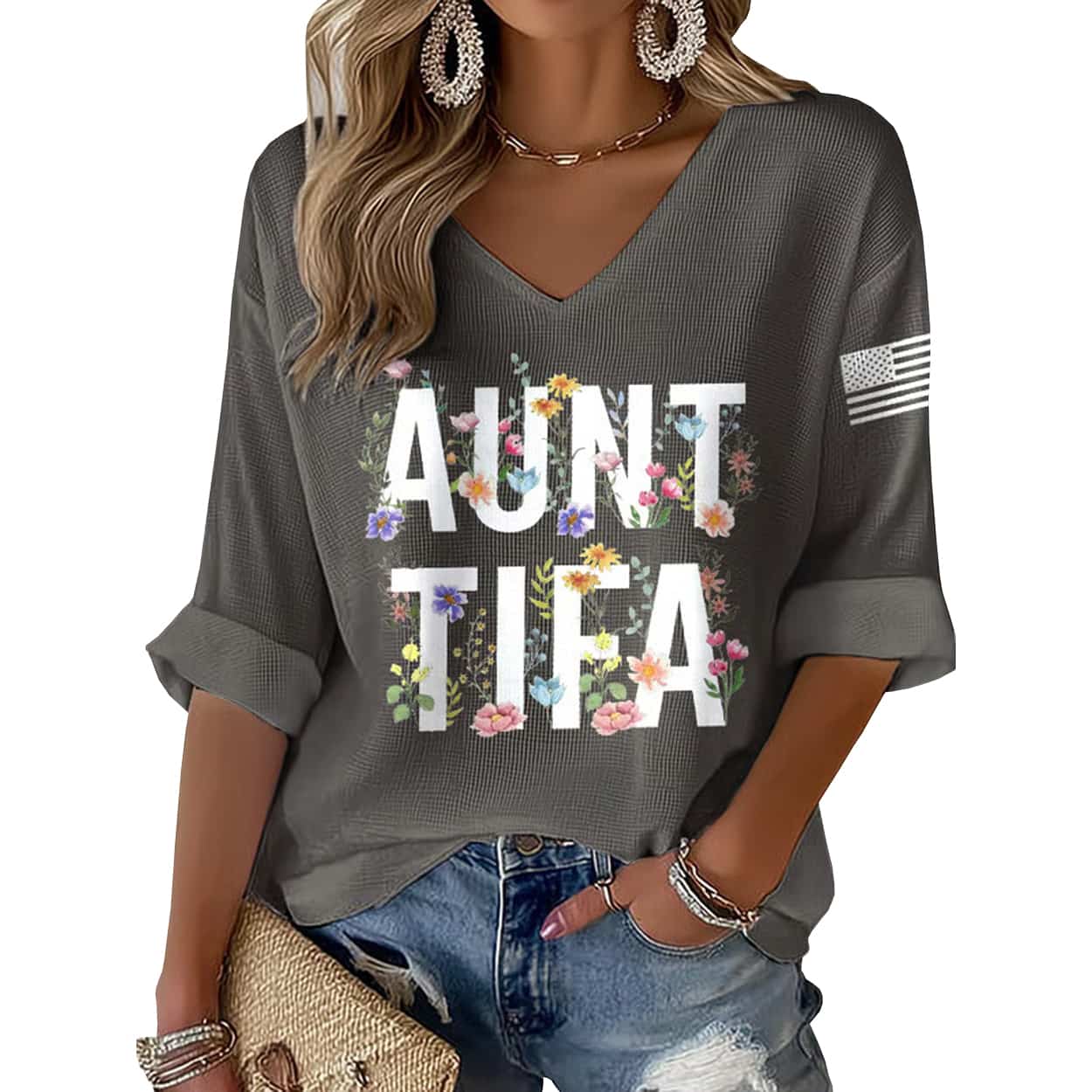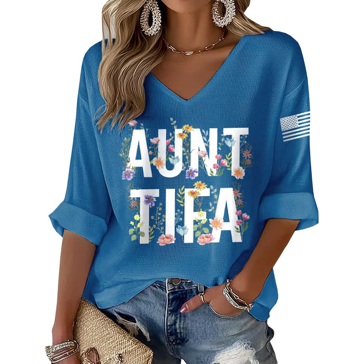 This shirt is a stylish blend of sass, softness, and subtle rebellion. This shirt features rolled-up sleeves and a flattering V-neckline, perfect for casual flair. The word “AUNTIFA” is boldly printed across the chest in large white letters, each letter blooming with colorful floral accents. A white-striped American flag detail on the left sleeve adds a touch of patriotic edge. This shirt is a wearable wink to those who lead with love and stand for justice.
