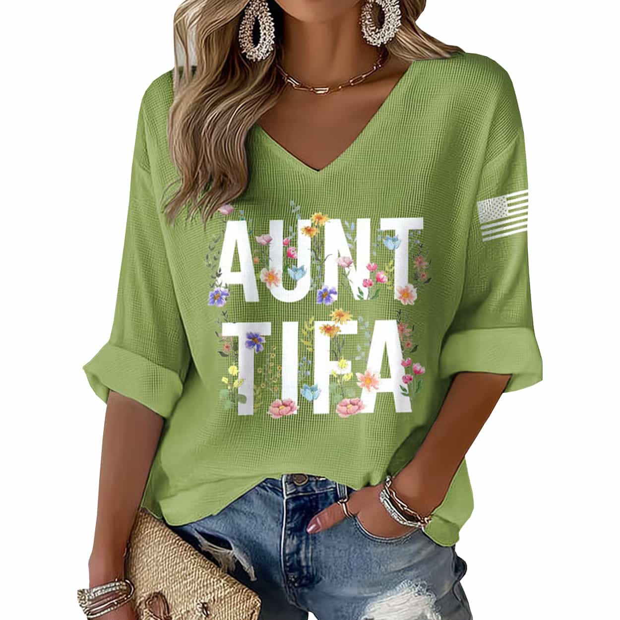 Make a bold yet charming statement with the V-Neck Retro Aunt Tifa Floral Print Waffle T-Shirt—where resistance meets radiant style. A playful nod to protest culture wrapped in flowers and flair.