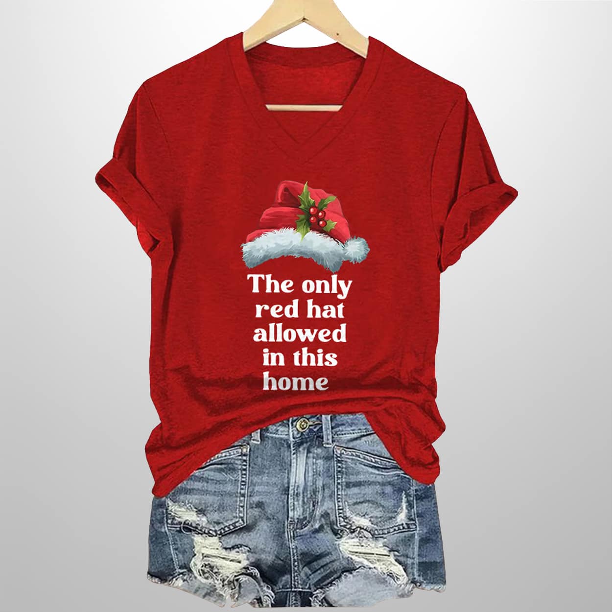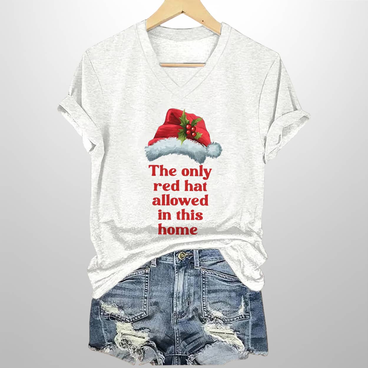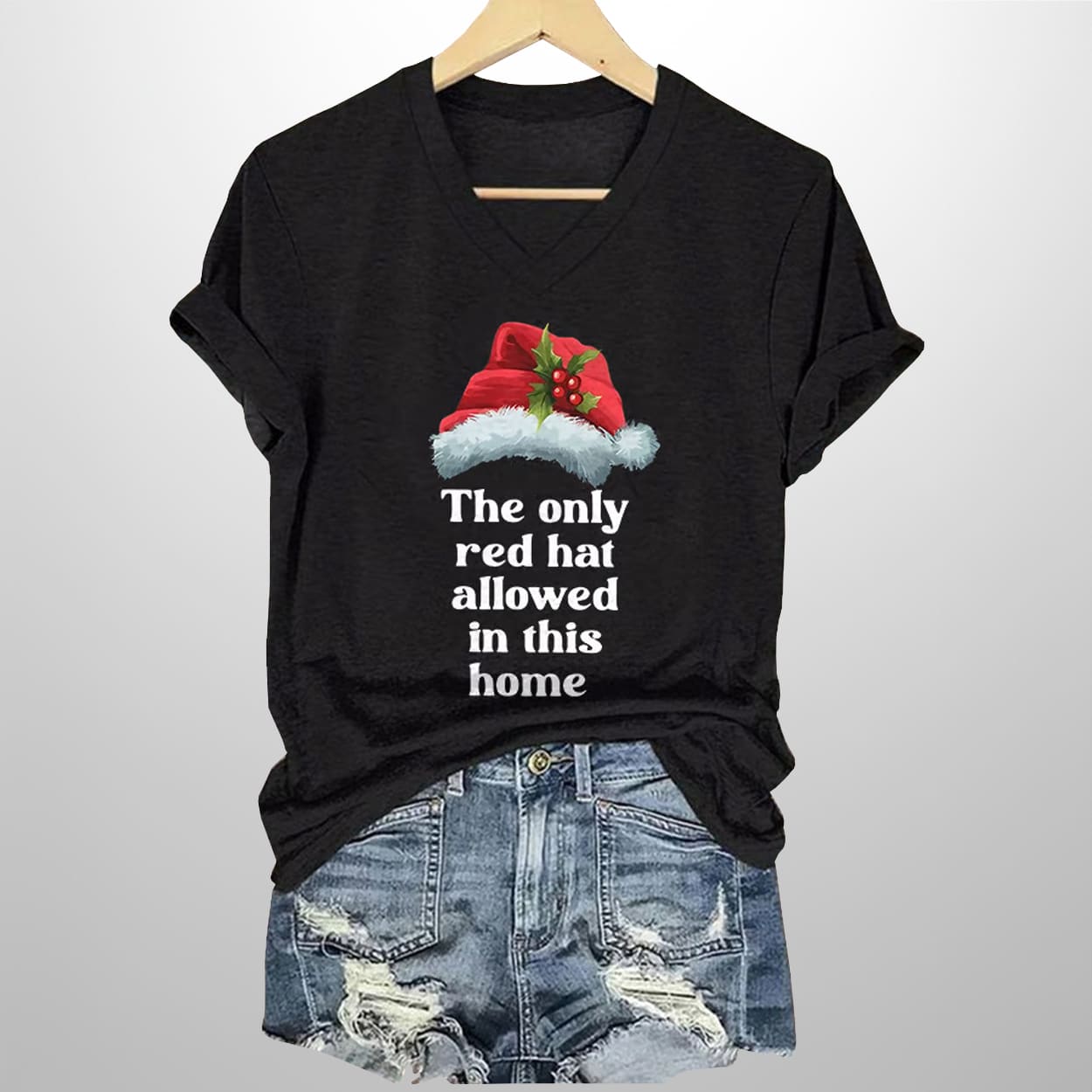 V-Neck Retro Christmas The Only Red Hat Allowed In This Home Print T-Shirt