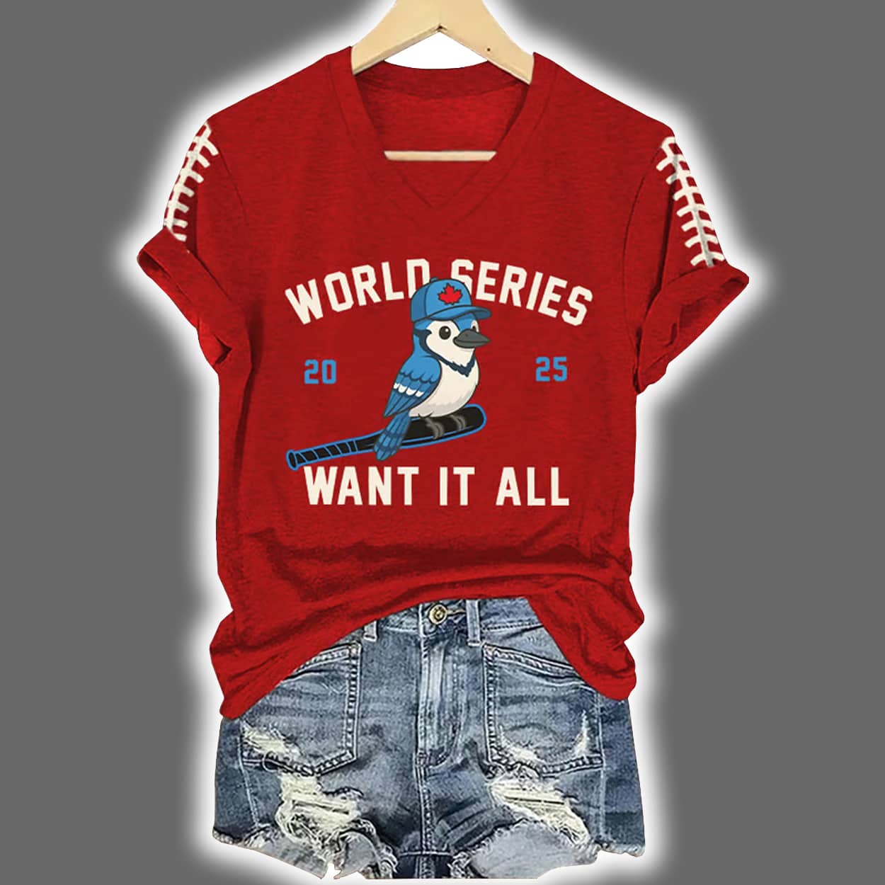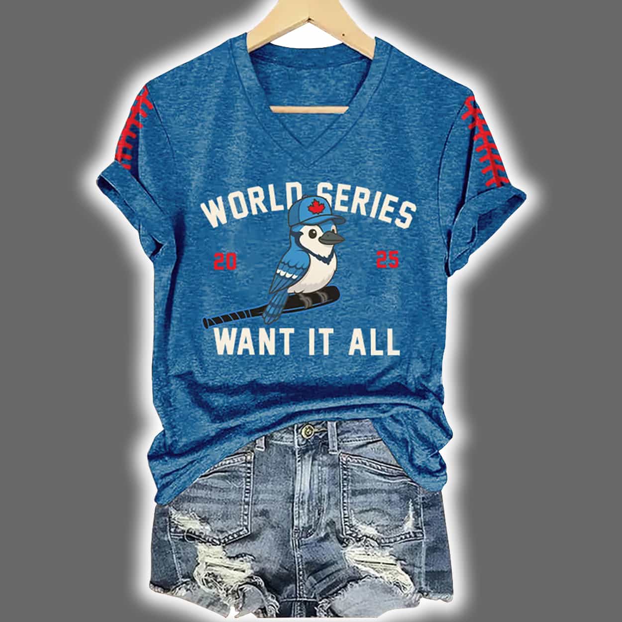 Slide into style with this shirt. This electric blue tee brings the heat with red lace-up sleeve details and a bold front graphic that’s impossible to ignore. Front and center, a feisty bird mascot grips a baseball bat while rocking a red cap—ready to knock one out of the park. Above it, “WORLD SERIES” shouts your championship dreams, while “WANT IT ALL” anchors the design with unapologetic ambition.